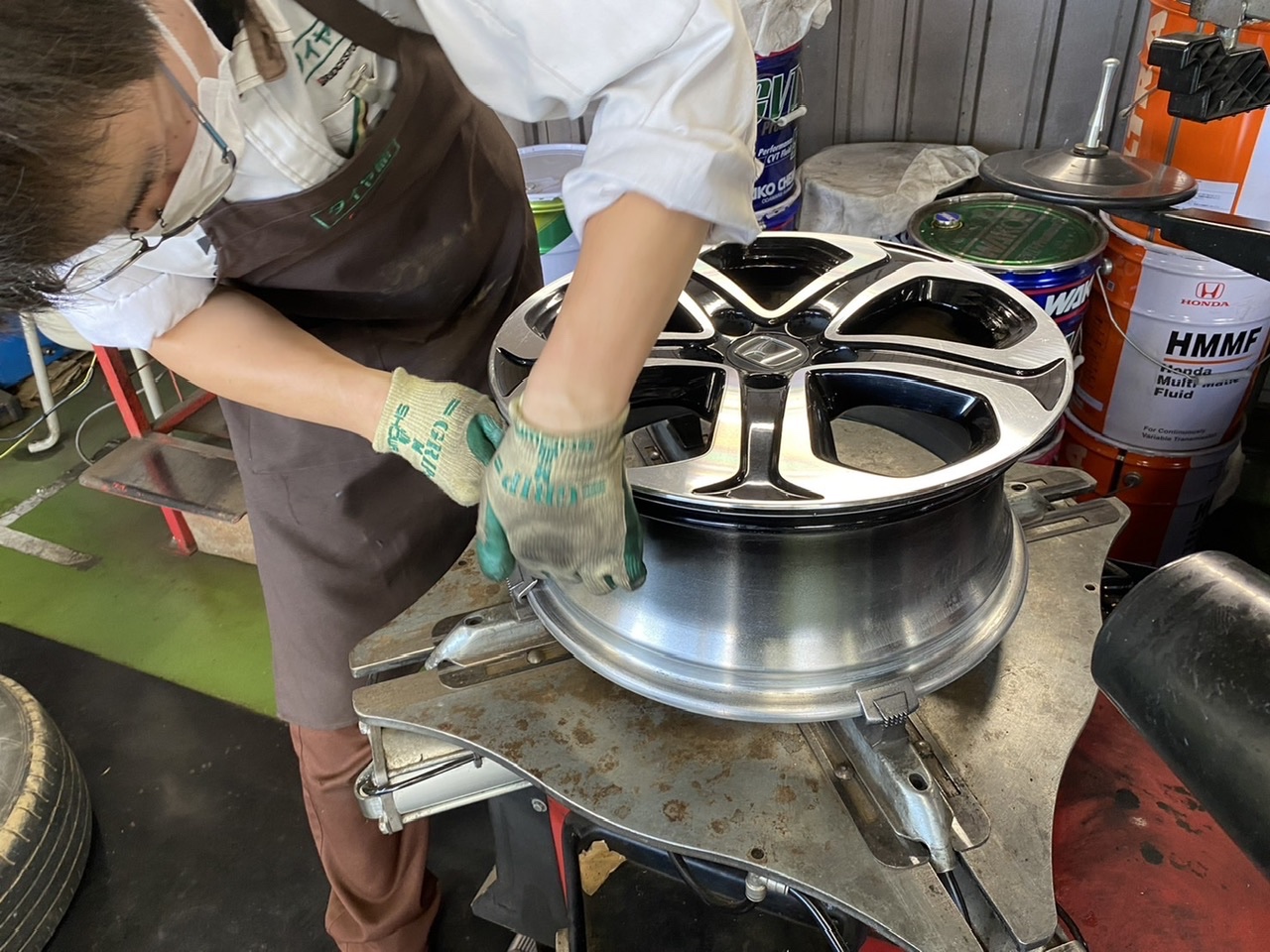 専用の機械を使いタイヤをホイールからバラシ、組んでいきます。
