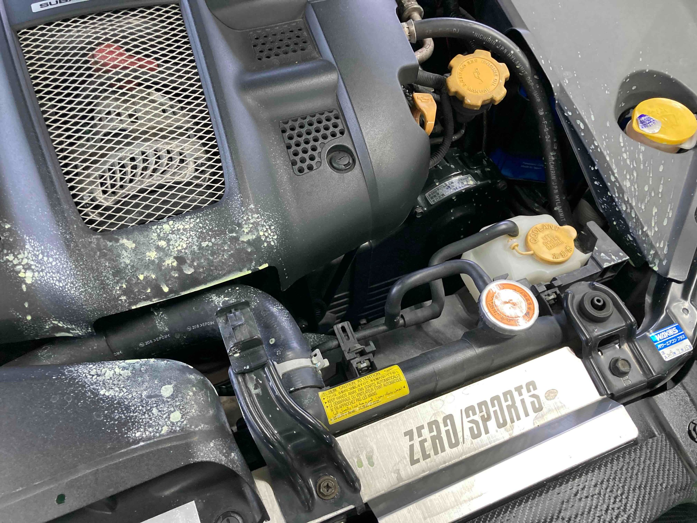 エンジンルームを開けると、カバーのあちこちに冷却水が飛び散った跡が↓