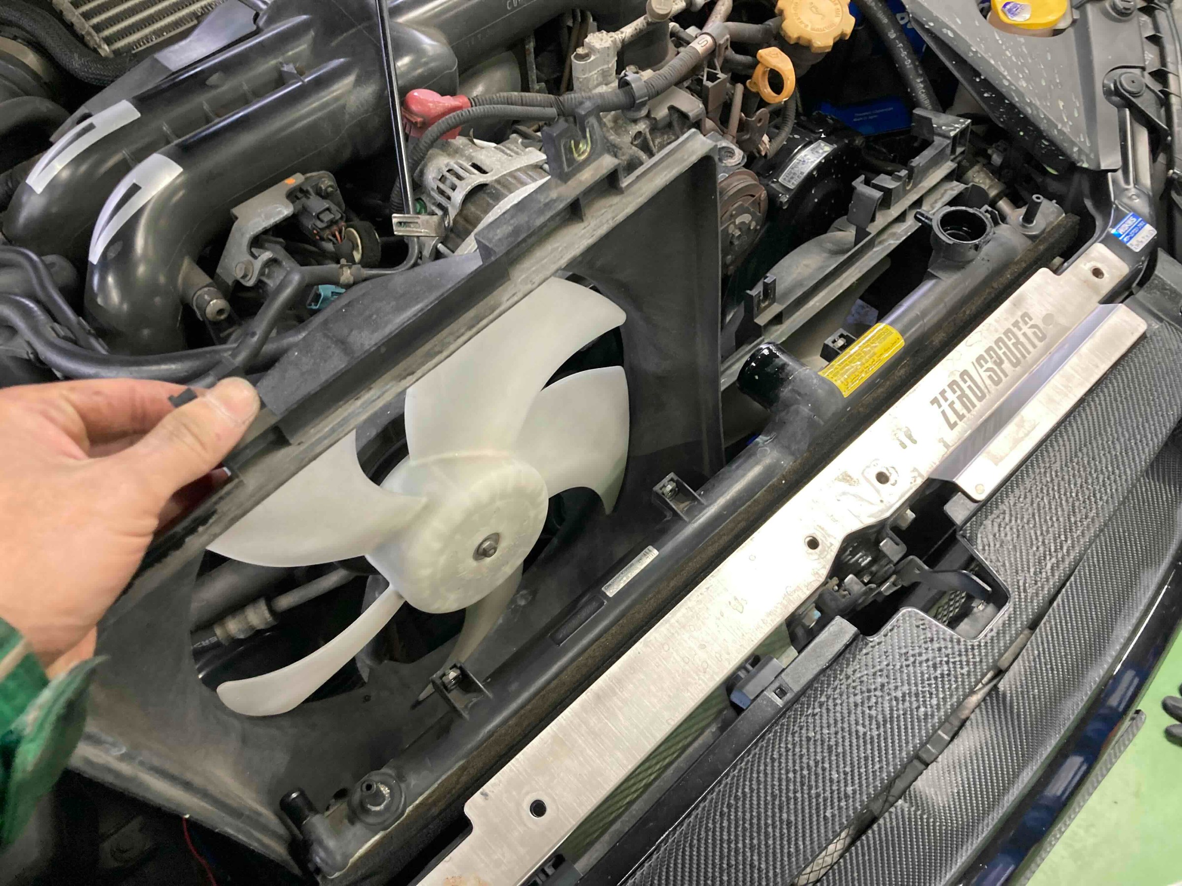 下から冷却水を抜いたら、各ホースを切り離し、電動ファンを取り外します↓