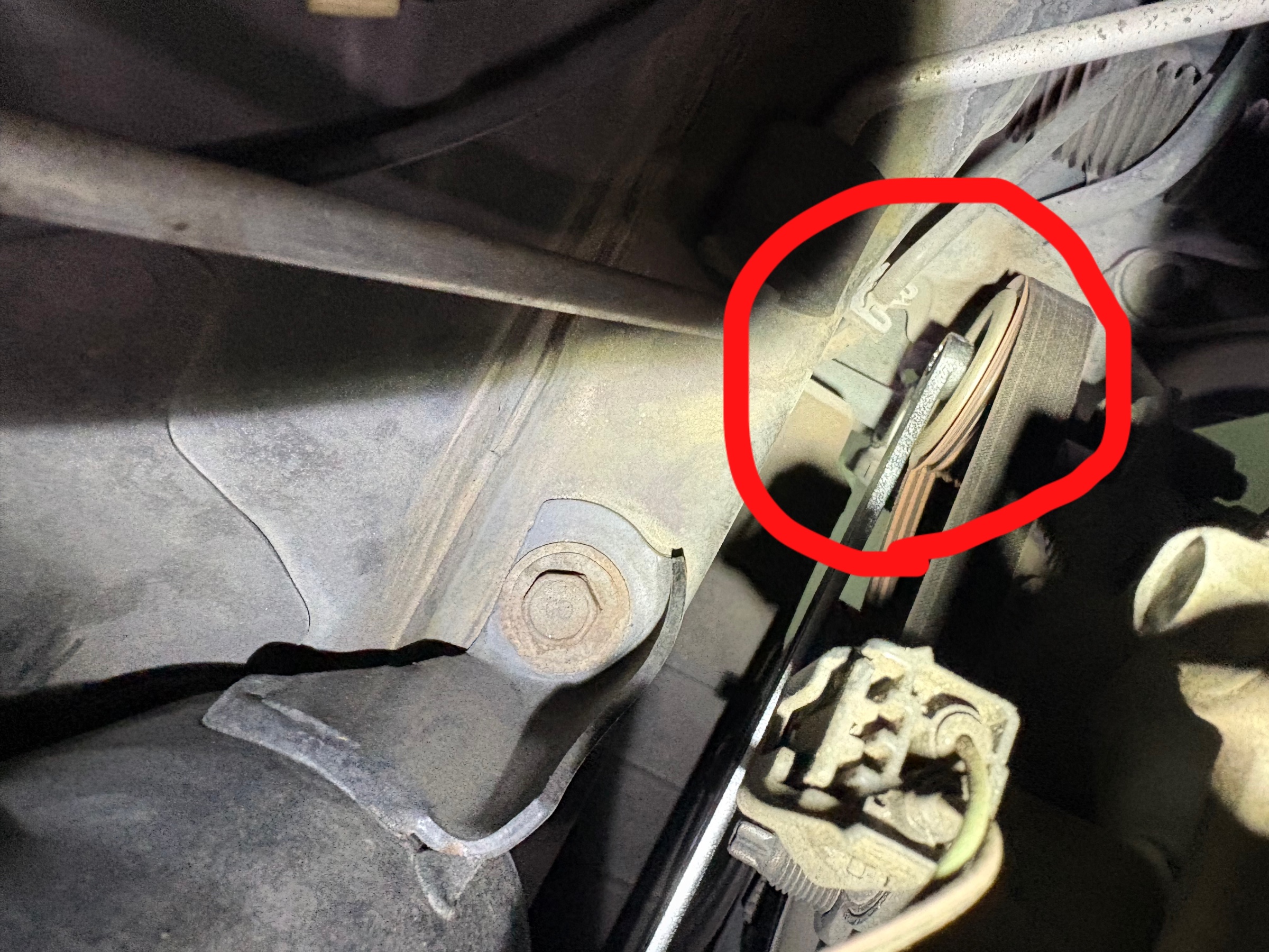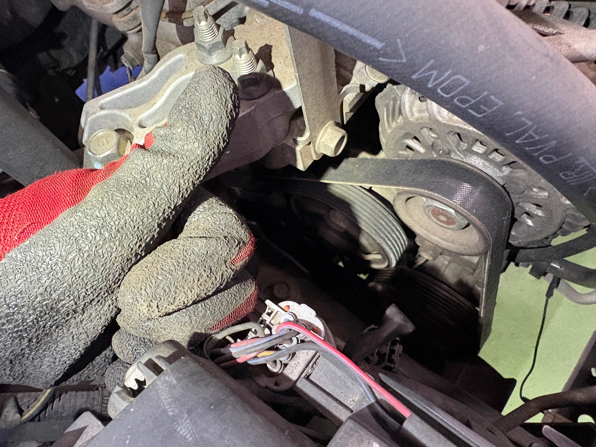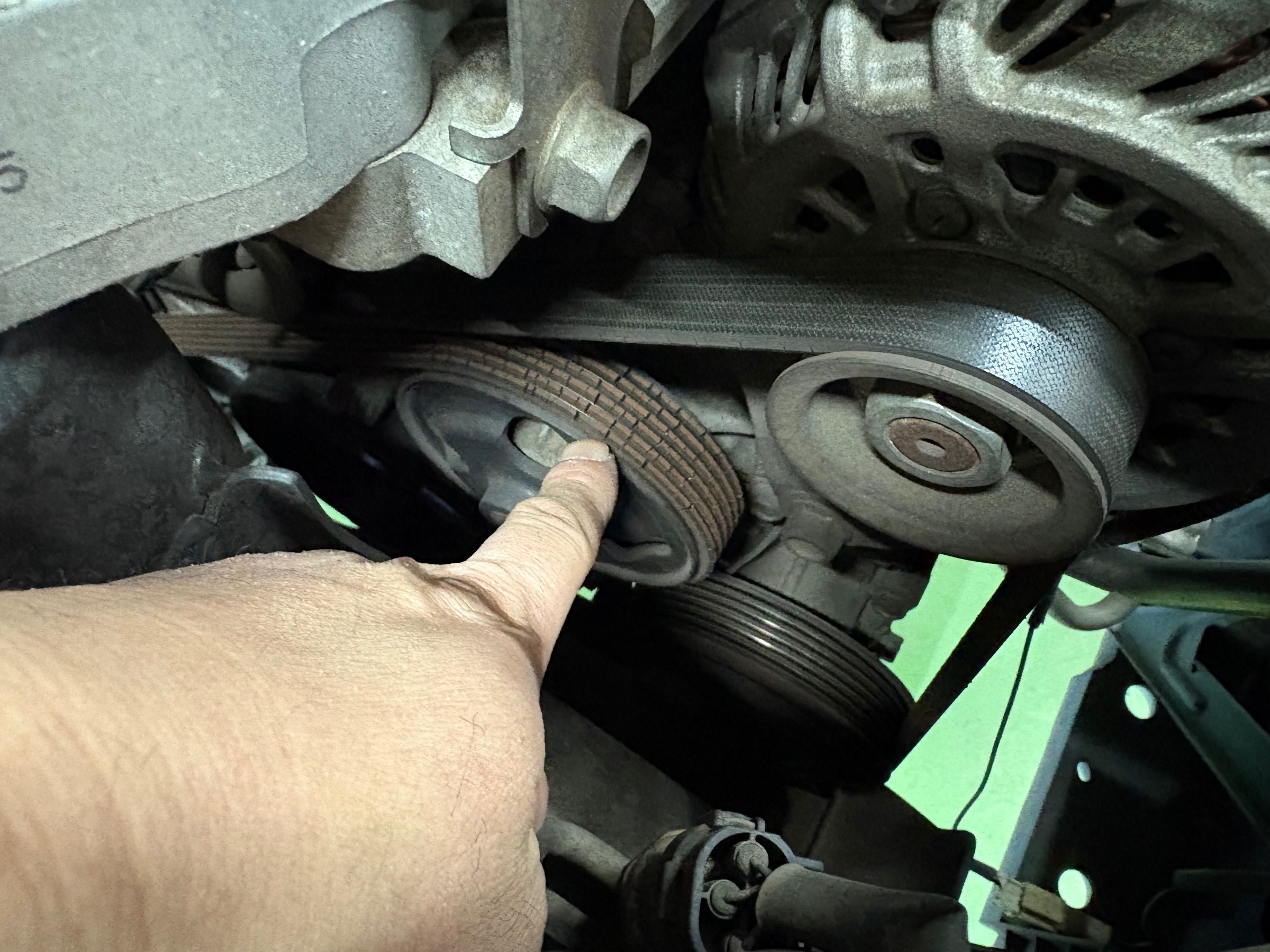 ベルトを外すには、テンショナーにレンチをかけてグイっと動かして張りを緩めてあげればOK。
