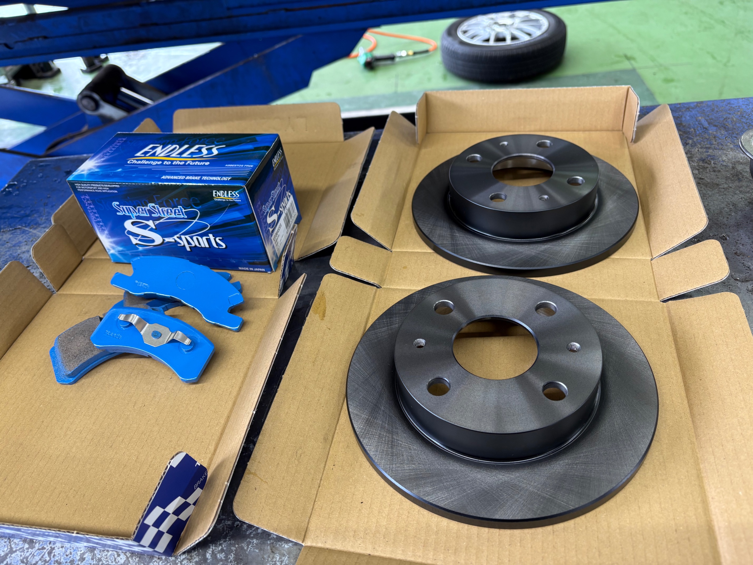 という事で、ブレーキパッドには【エンドレス Super Street Ssports】を。ディスクローターは純正品を使用して交換していきます。