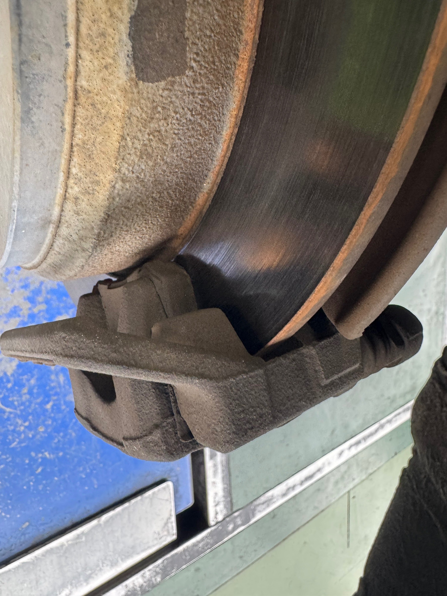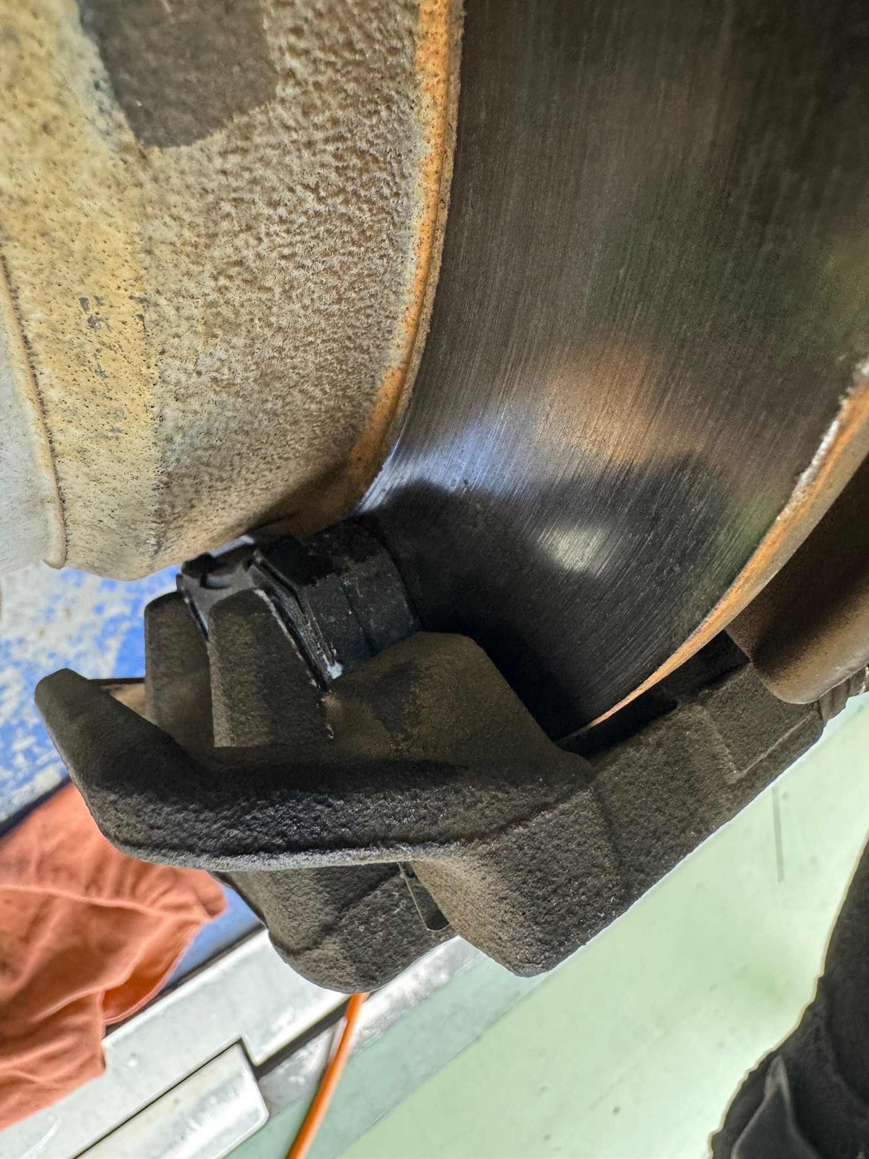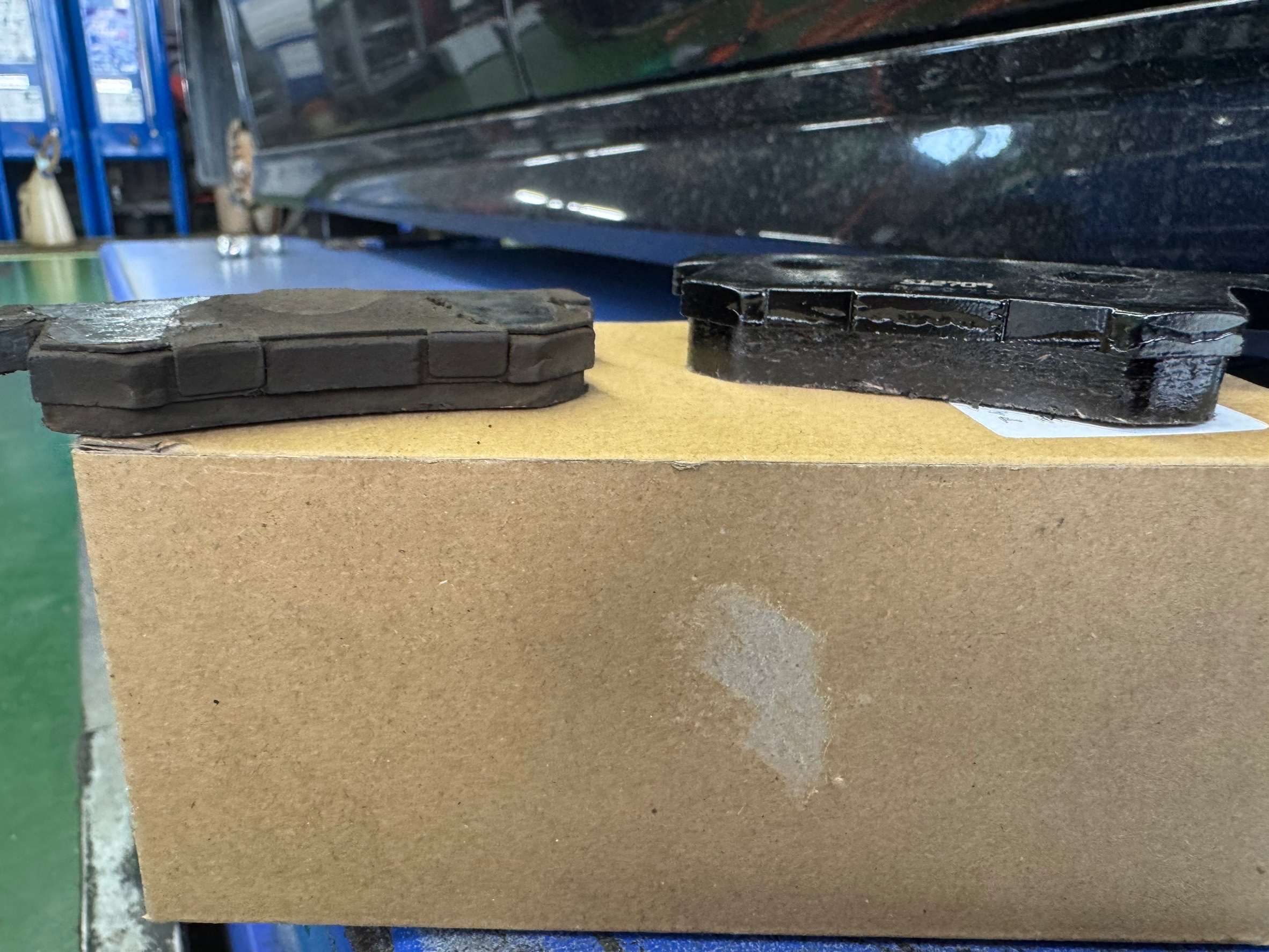 今回交換する理由としては、異音がしておりブレーキを調べたところブレーキパッドから【キー】という音が鳴っておりパッドを見てみるとかなり減っていた為交換させていただきました。
