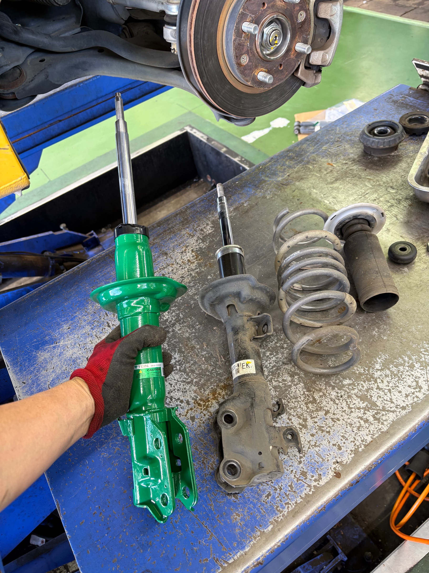 まずはフロントから交換していきます。車両から取り外しまして・・・