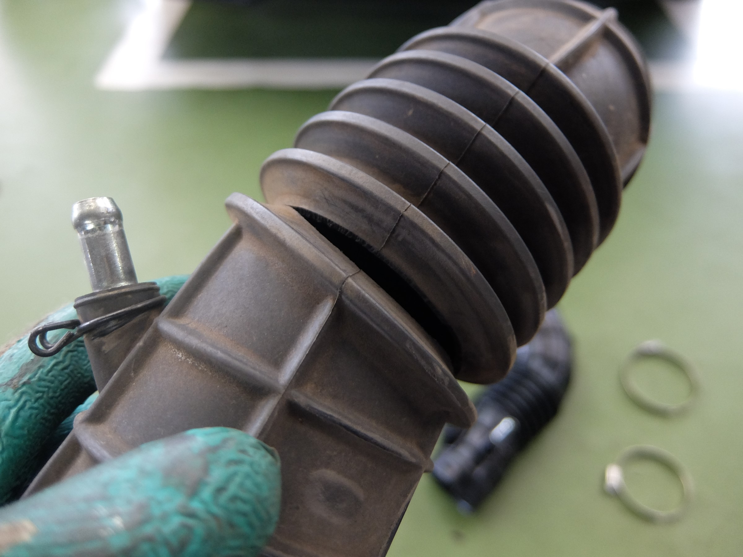 先日無料の安全点検時にエンジンエアーフィルターを点検の為に外すタイミングで、エアーダクトの蛇腹部分に亀裂があるのを発見!!