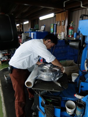 たくさんのタイヤとホイールをみんなでラップで巻き、汚れないように展示してあります