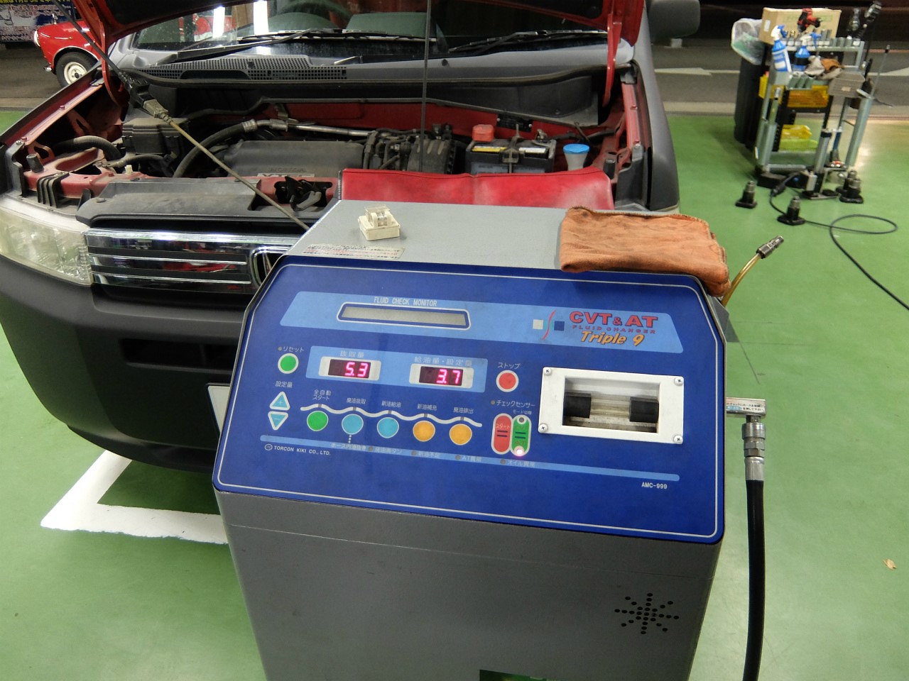 交換に使うのはこちらのトルコンチェンジャー、この機械によりATFの劣化の点検や交換作業を行います。