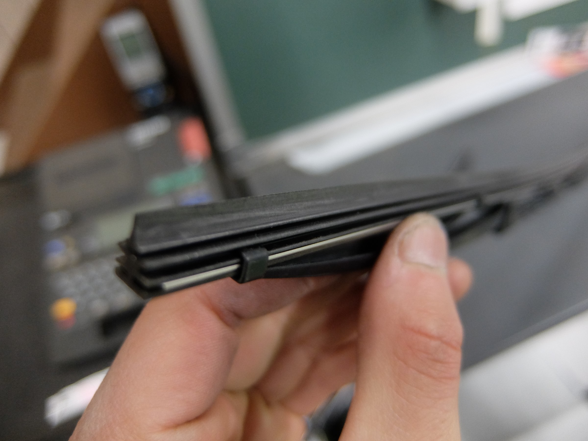 ワイパーブレードを左右に振ってみて、この部分がガタついているようなら、ゴムだけではなくブレードごとの交換をオススメします。
