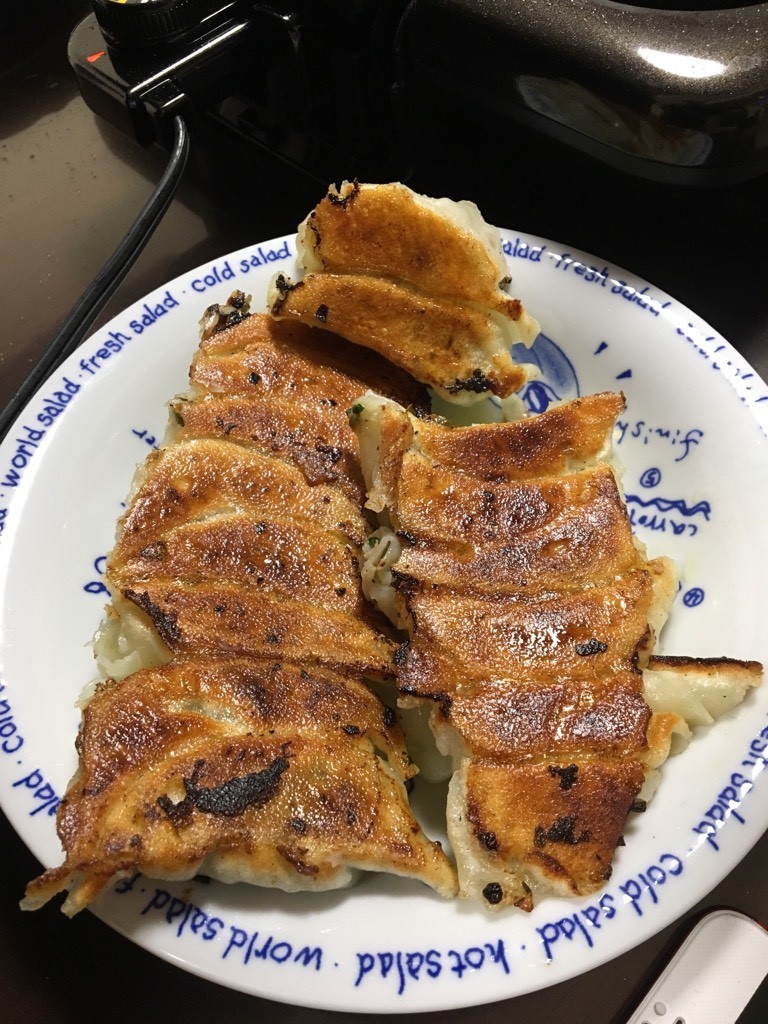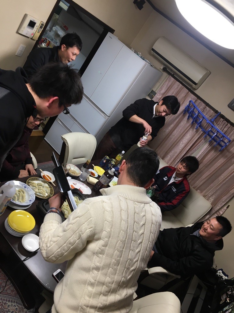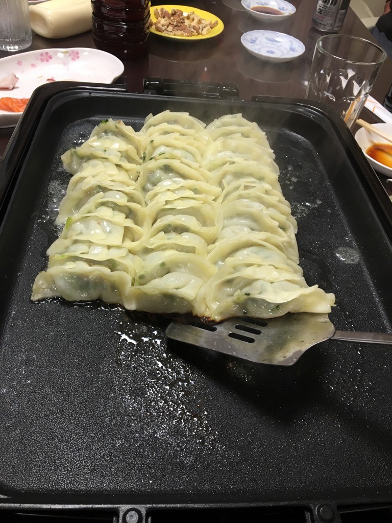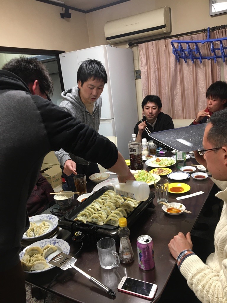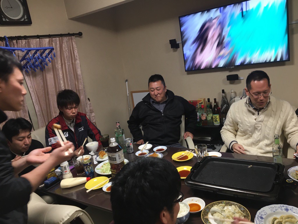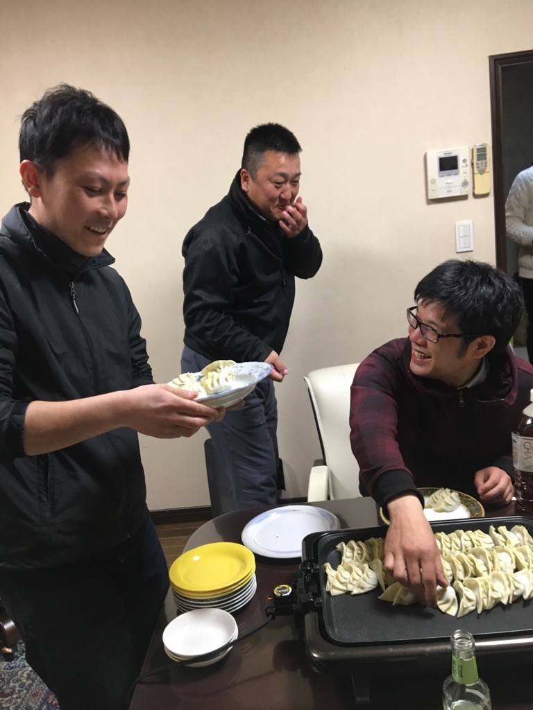 今回のメインディッシュは伊賀主任・櫻井PIT長・隅内スタッフによるお手製餃子、みんなで並べて焼いていきます。