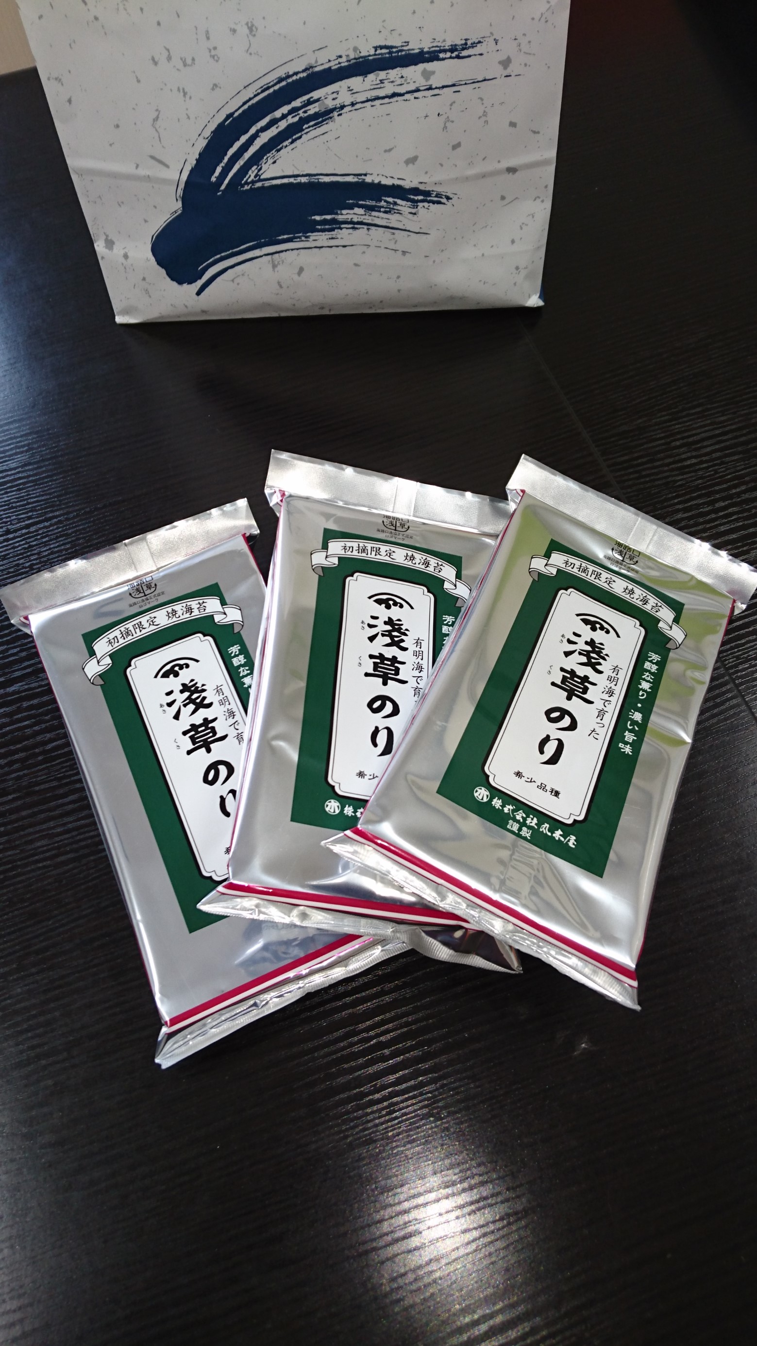 今日はお昼に、先日法事などの御返しものを取り扱っている会社のお客様から頂いた、高級な海苔を戴きました)^o^(