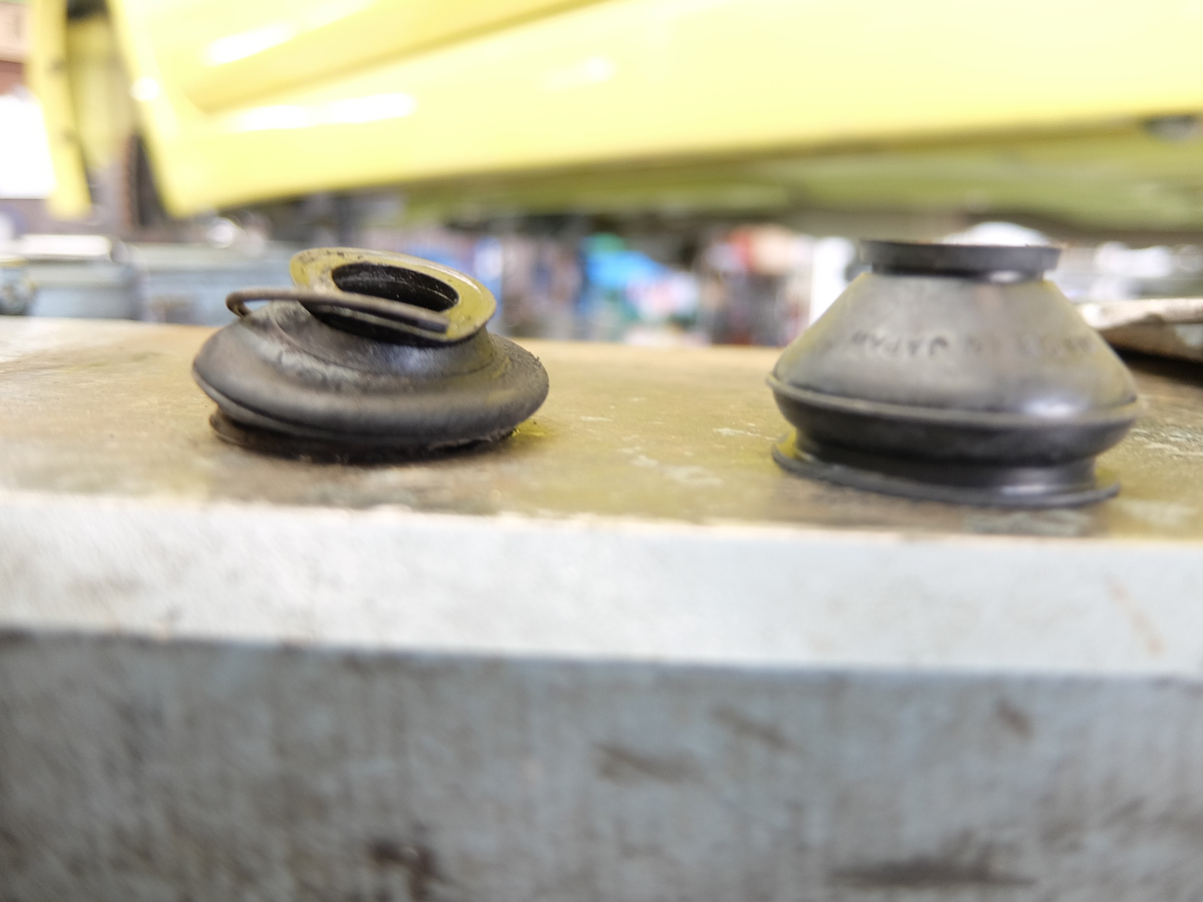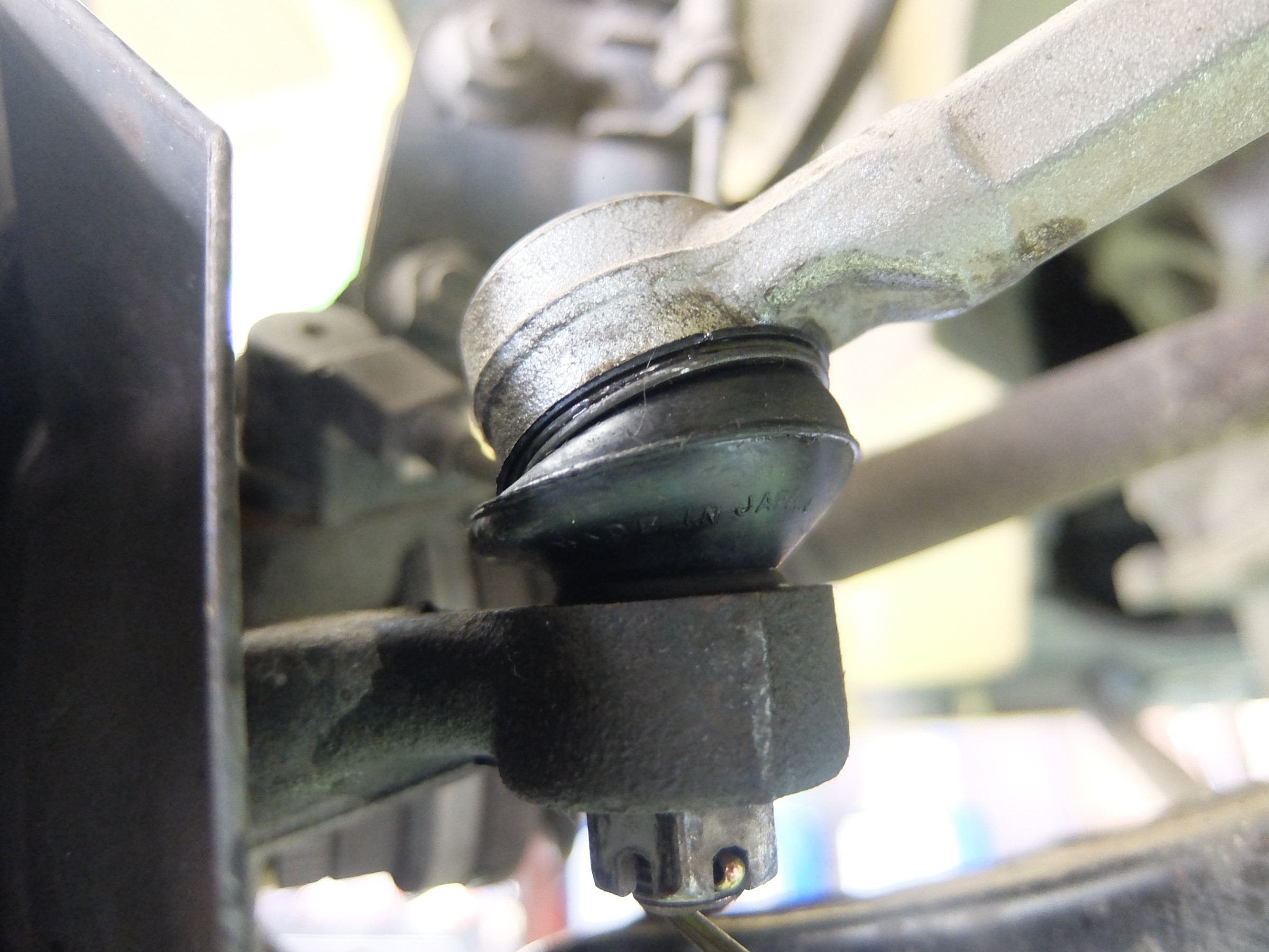 ステアリングタイロッドエンドの中はボールジョントになっていてグリスが詰まっています。タイロッドエンドブーツはゴミや異物が入るのを防ぐのとグリスの漏れ防止の役目もあります。このブーツが経年劣化などでひび割れなどで損傷しますと異物が中に入りボールジョイントを痛め最悪はジョイント部が外れハンドル操作ができなくなります。