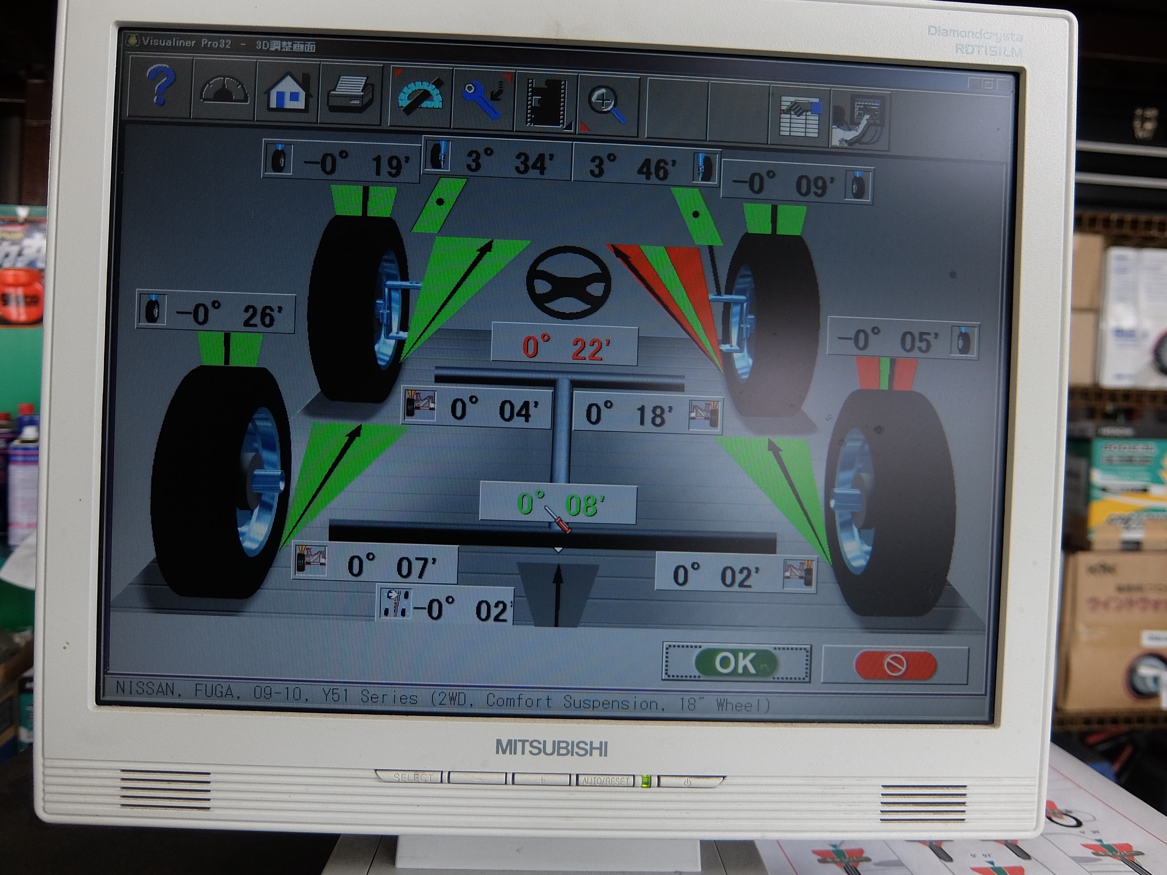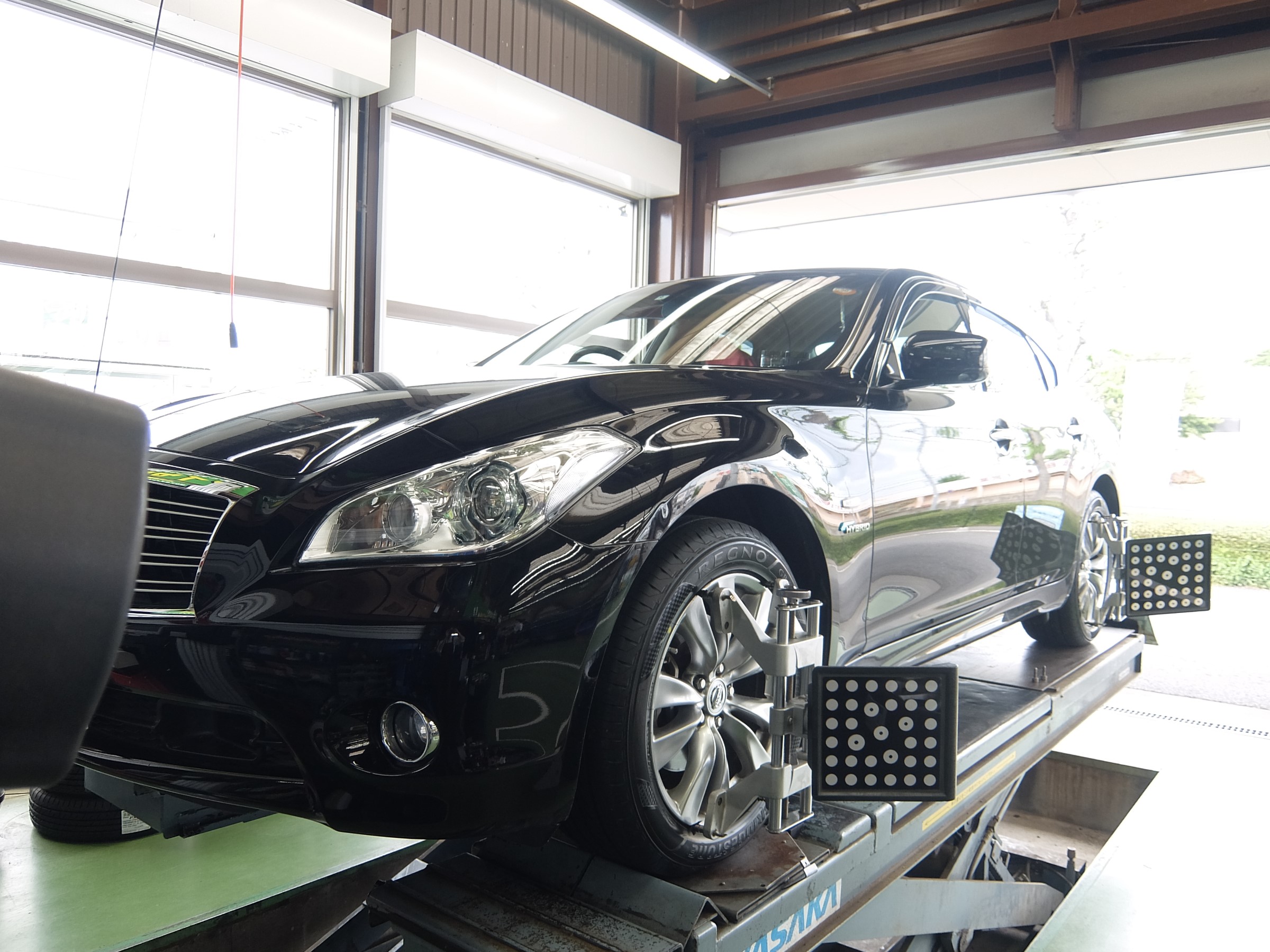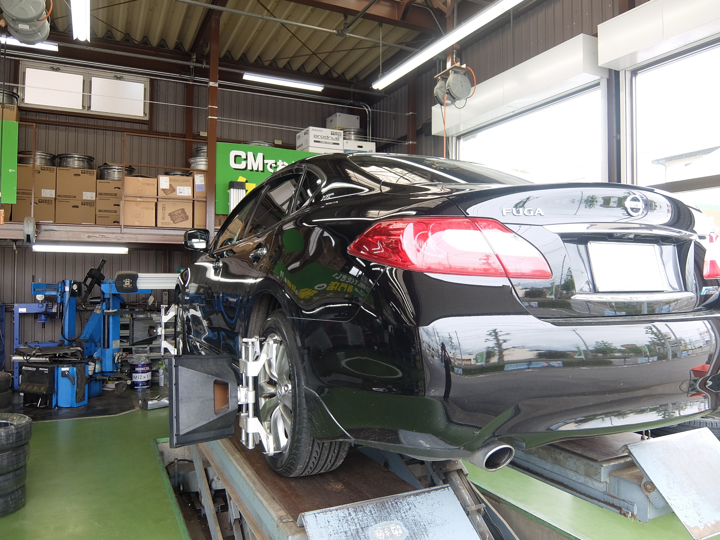 【ニッサン・フーガ】アライメント調整 ポスト 2018年5月1日 こんにちは!大山です! 本日は、ニッサン・フーガのご紹介になります。 アライメント調整のご依頼をいただきました。 アライメントは走行を重ねるごとに、徐々にズレてしまいます。 ズレが大きくなると、走行安定性の低下やタイヤ偏摩耗の原因になります。 定期的なアライメントの点検をおすすめします! カテゴリ:タイヤ関連 担当:大山