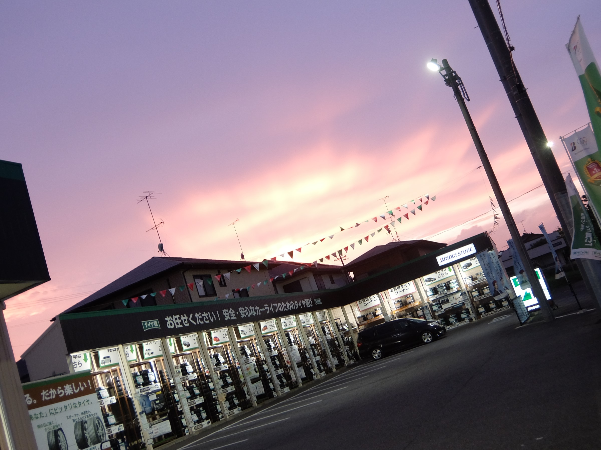 そんな日の夕方、ピットの前で木村店長が「空がきれいだな~」とつぶやいているので空を見てみると、こんな夕焼け空が広がっていました。