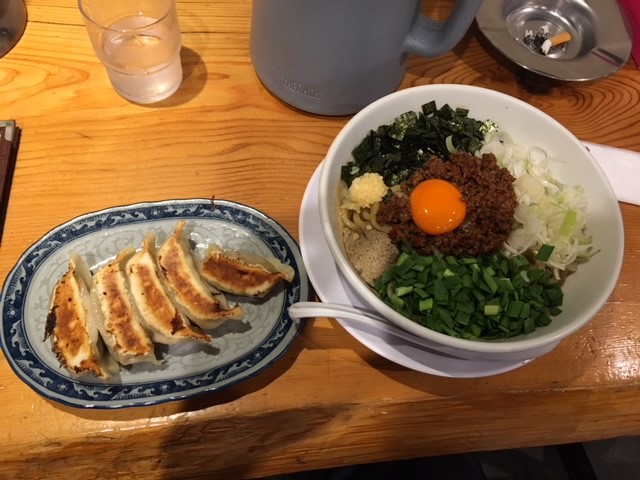 注文したのは、大山チーフいちおしの台湾まぜそばです。唐辛子と山椒の辛味に、ニンニクと刻みニラの香りが良く合います。とてもおいしゅうございました。一緒に注文した龍神ギョーザは、具材の味付けがしっかりしていて醤油はいらない感じです。おいしゅうございます。