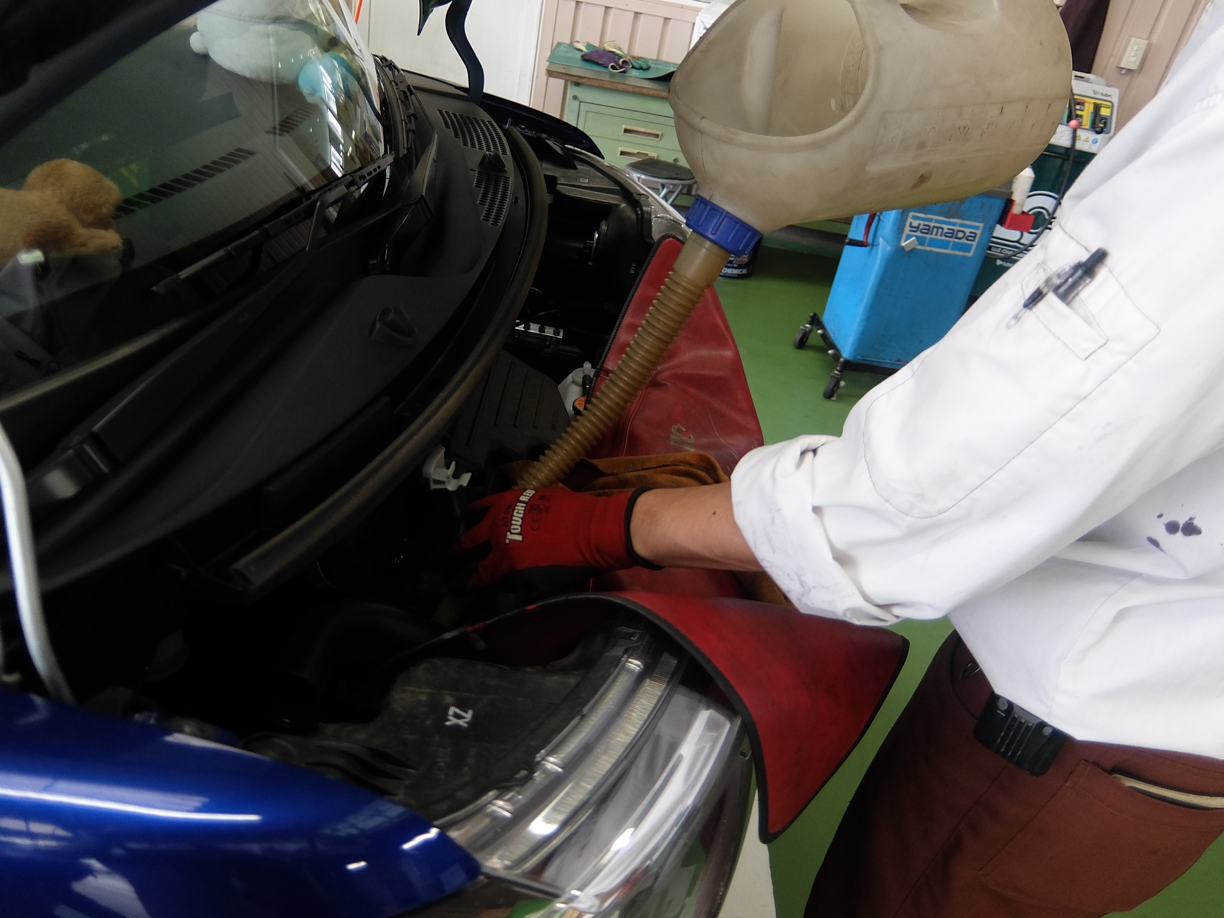 廃油後は新しいものオイルを注入し、レベルゲージで油量を確認して作業完了です。使用オイルはWAKO'SのEX-C 5W-30というもので、お手頃な価格ですが性能は決して悪くない、コストパフォーマンスに優れたエンジンオイルです。エンジンオイル交換は定期的に行ってあげるか、あるいはサボってしまうかによってその後の車の寿命は大きく変わってきます!愛車に長く大切に乗っていくためには、走行距離は3000kmごと、時間では3ヶ月ごとにエンジンオイル交換をしてあげると理想的です!