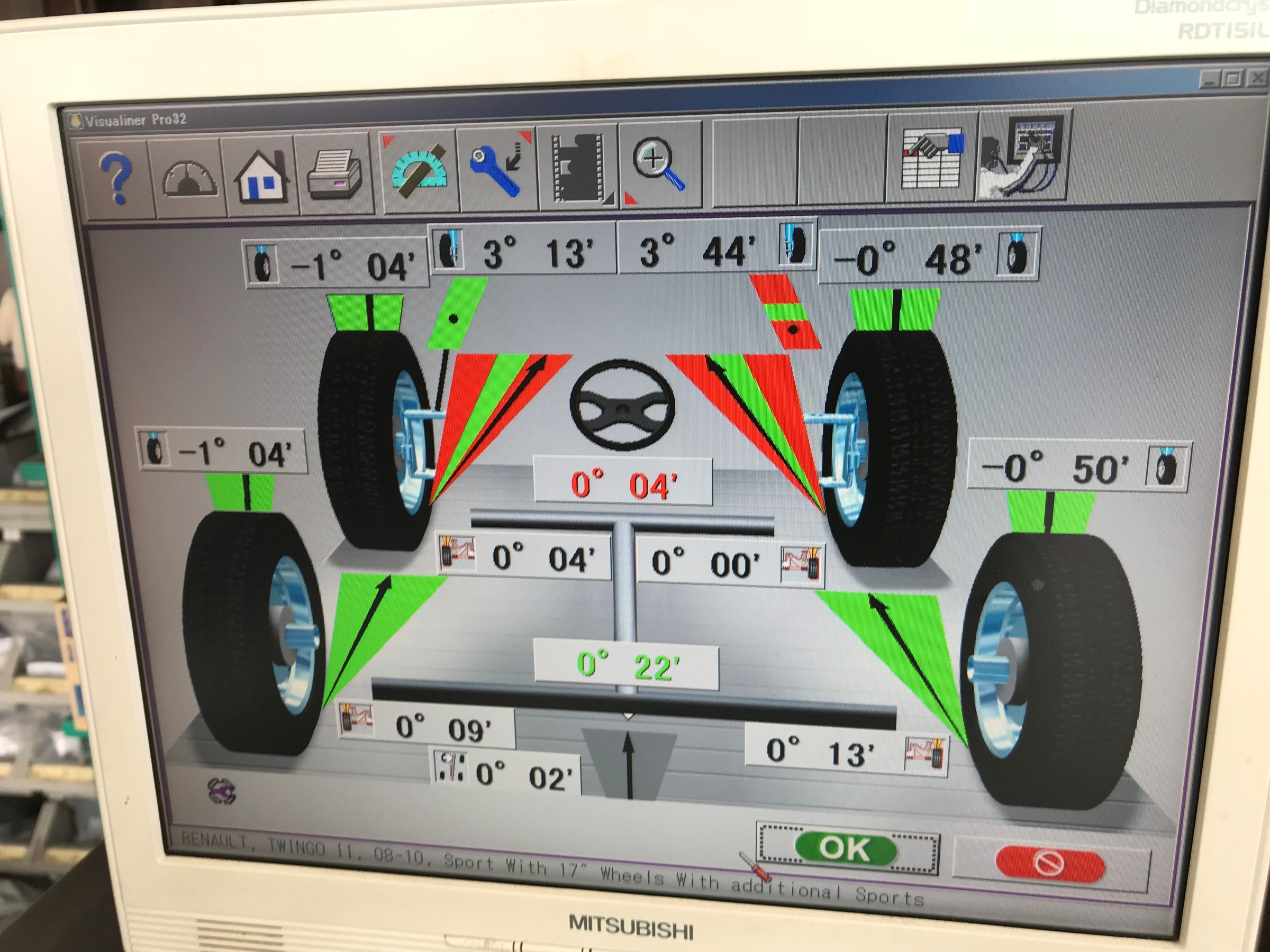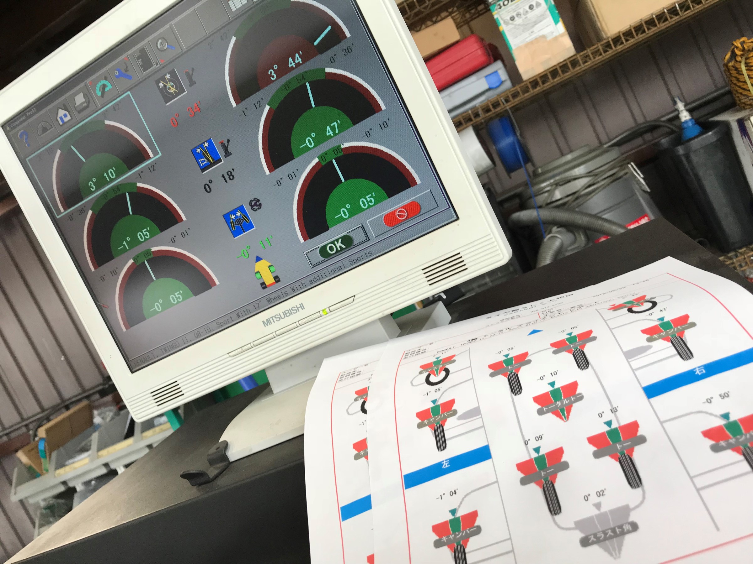 トゥインゴはフロントトゥの2か所のみ調整なのですが、基準値から左右ともずれてしまっていたのでサクッと調整。