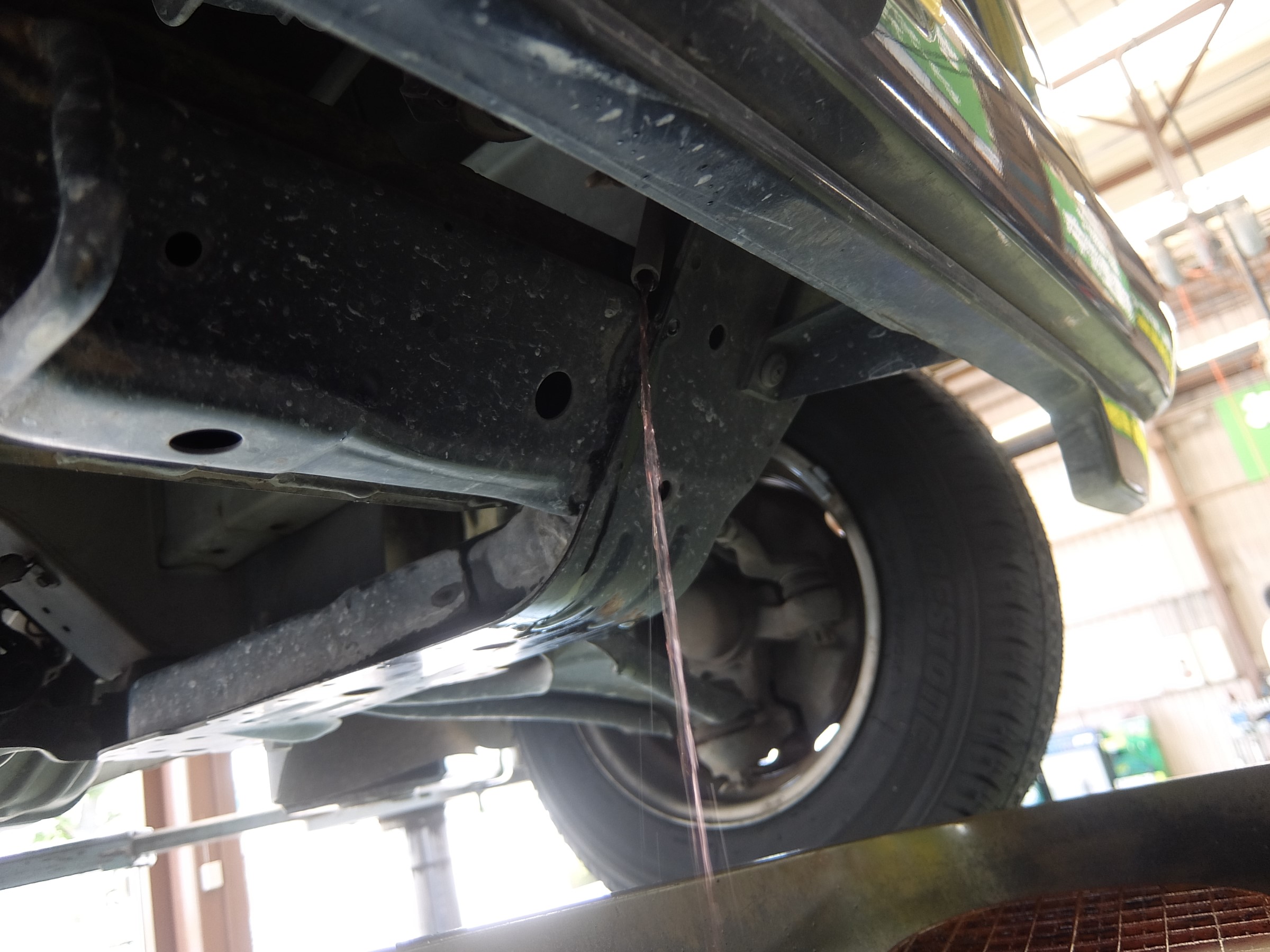 お客様より「車体下から何やら水が漏れていた」というご相談を頂き、リフトアップしてみたところラジエータロアホースの繋ぎ目から冷却水の漏れた形跡がみつかりました。