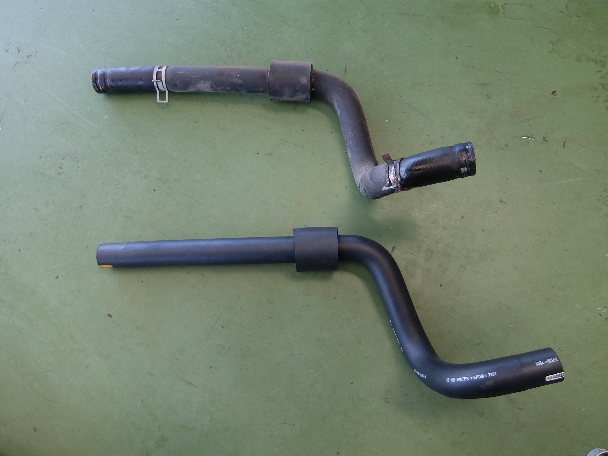 金属バンドをずらしてホースを慎重に引っ張ると古いホースが抜けました。新品と比較するとやはり年季を感じます。