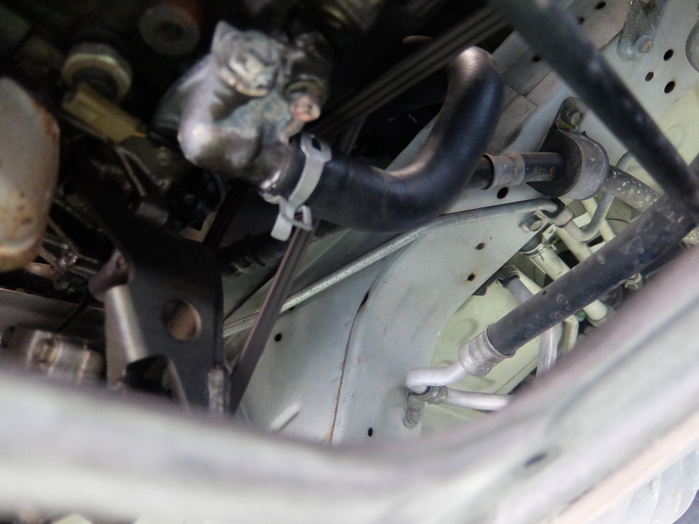 冷却水はエンジンの熱を奪い、アッパーホースを通ってラジエータで冷やされ、ロアホースを伝ってまたエンジンを冷やしにいくという循環をしています。今回漏れがあったのはロアホースのほうでした。