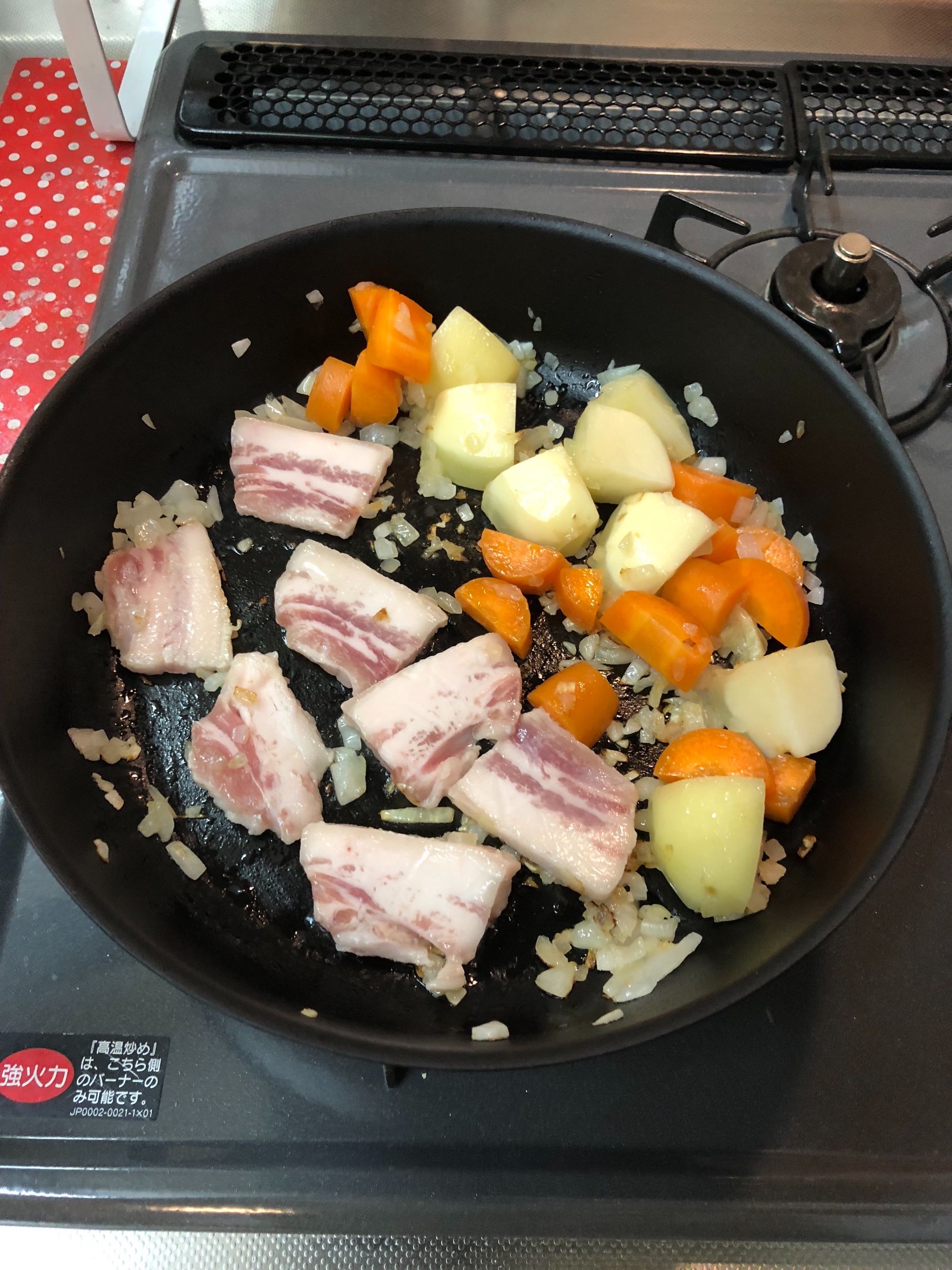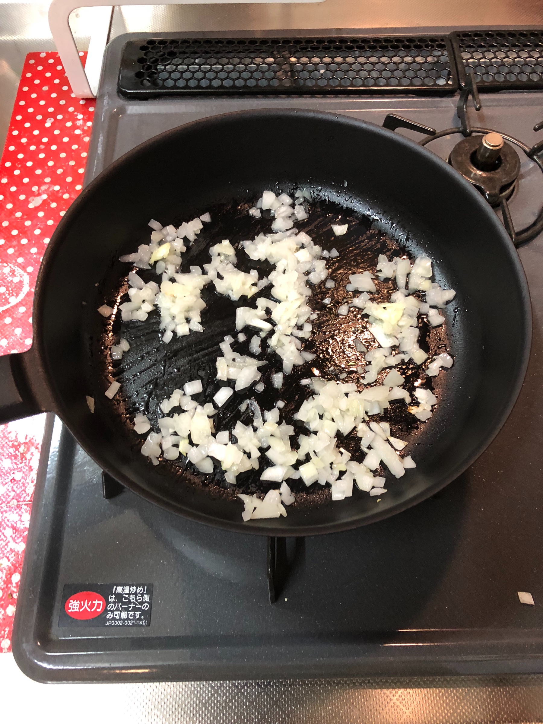 これに油をひいて玉ねぎのみじん切りを炒めていきます( ..)φメモメモ
