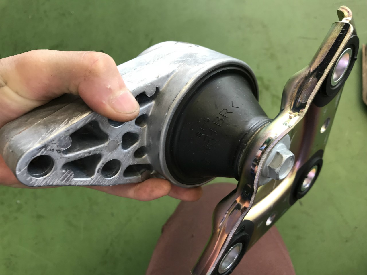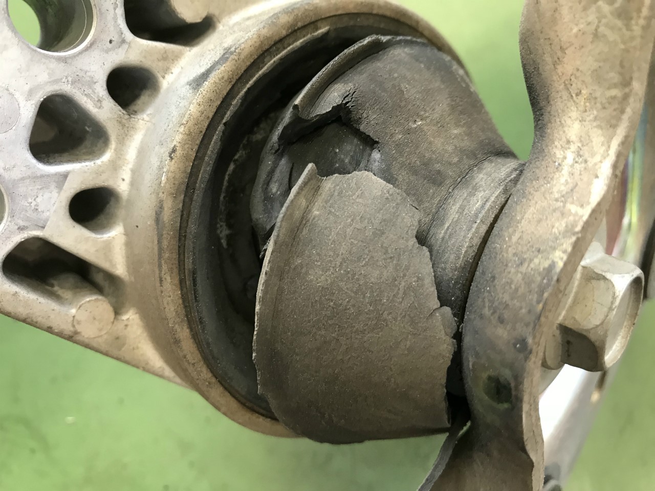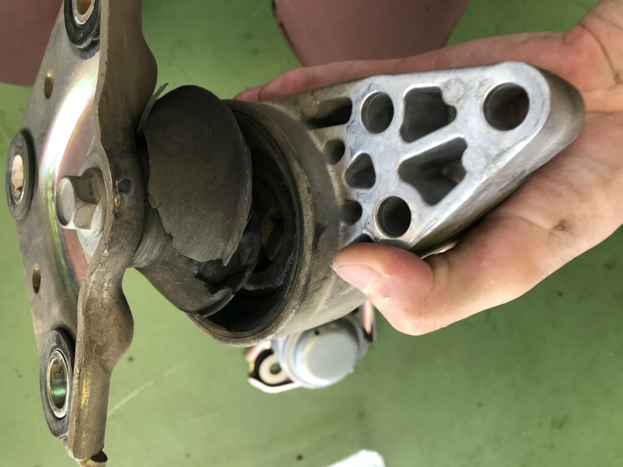 エンジンマウントです。エンジンが振動しているときにマウントを手でグッと抑えると、うるさい音が止まるのです。まず間違いないだろうと踏んで、部品を手配。そして外してみると・・・。