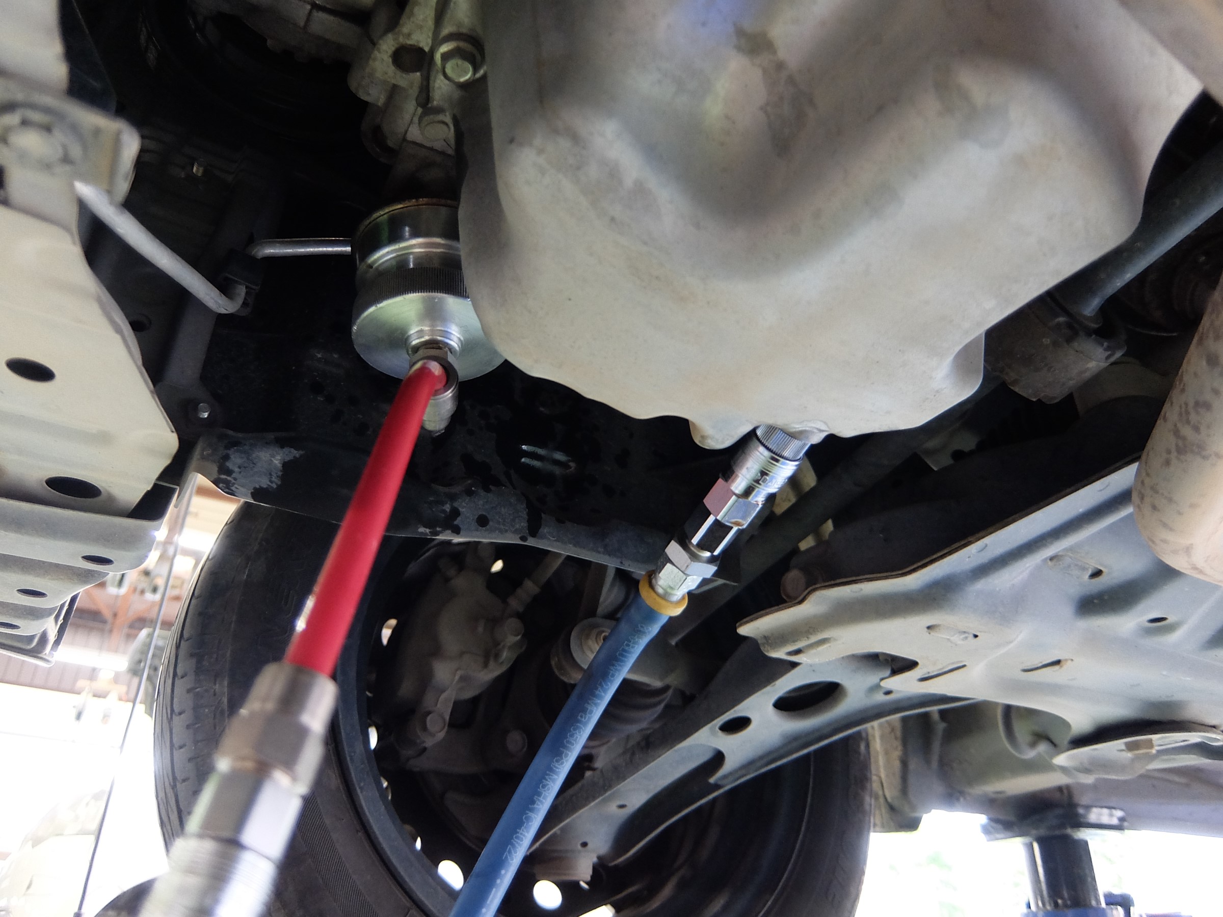 その後、オイルパンのドレンボルトとエレメントに専用のホースを接続します!