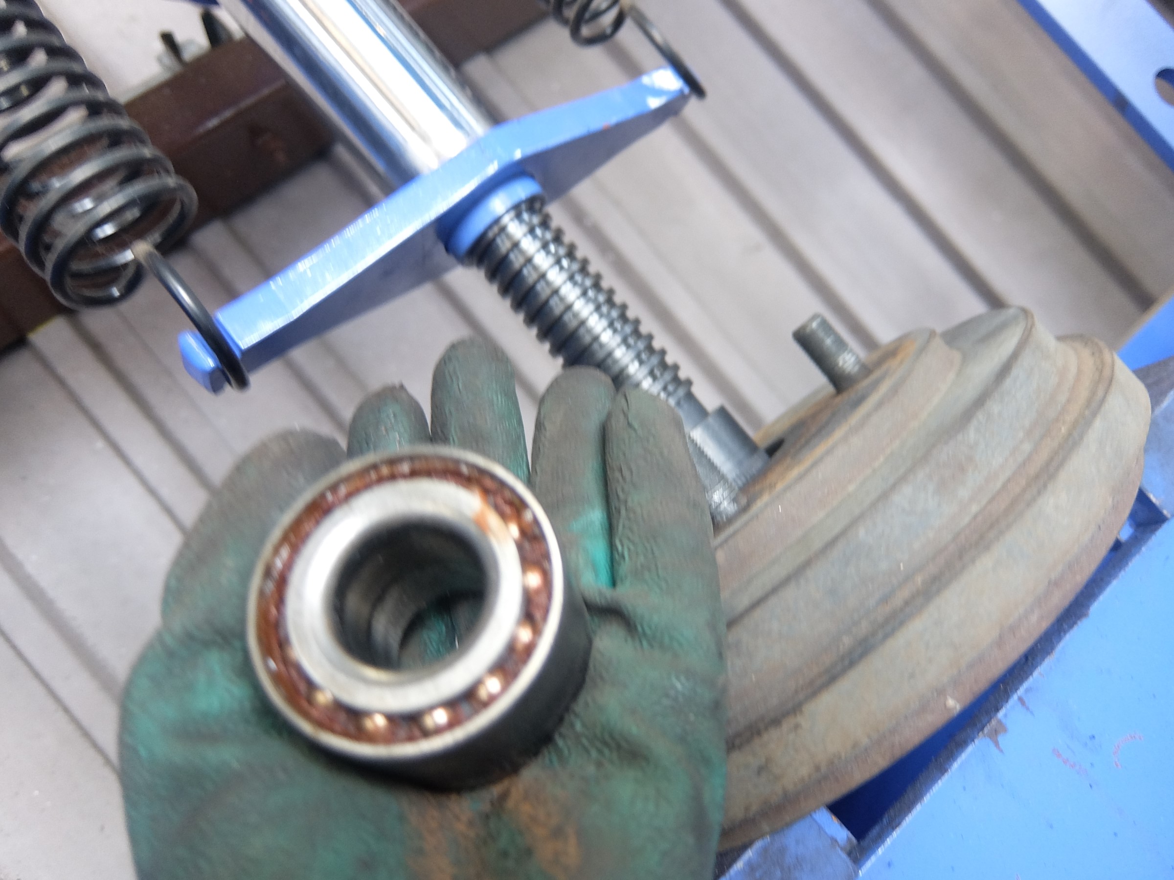 この中心には、車輪をスムースにくるくる回す為の「ベアリング」という物が圧入されているのですが、それを外してみると・・・