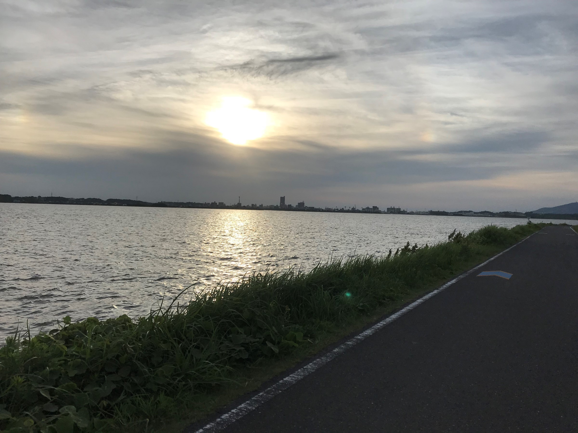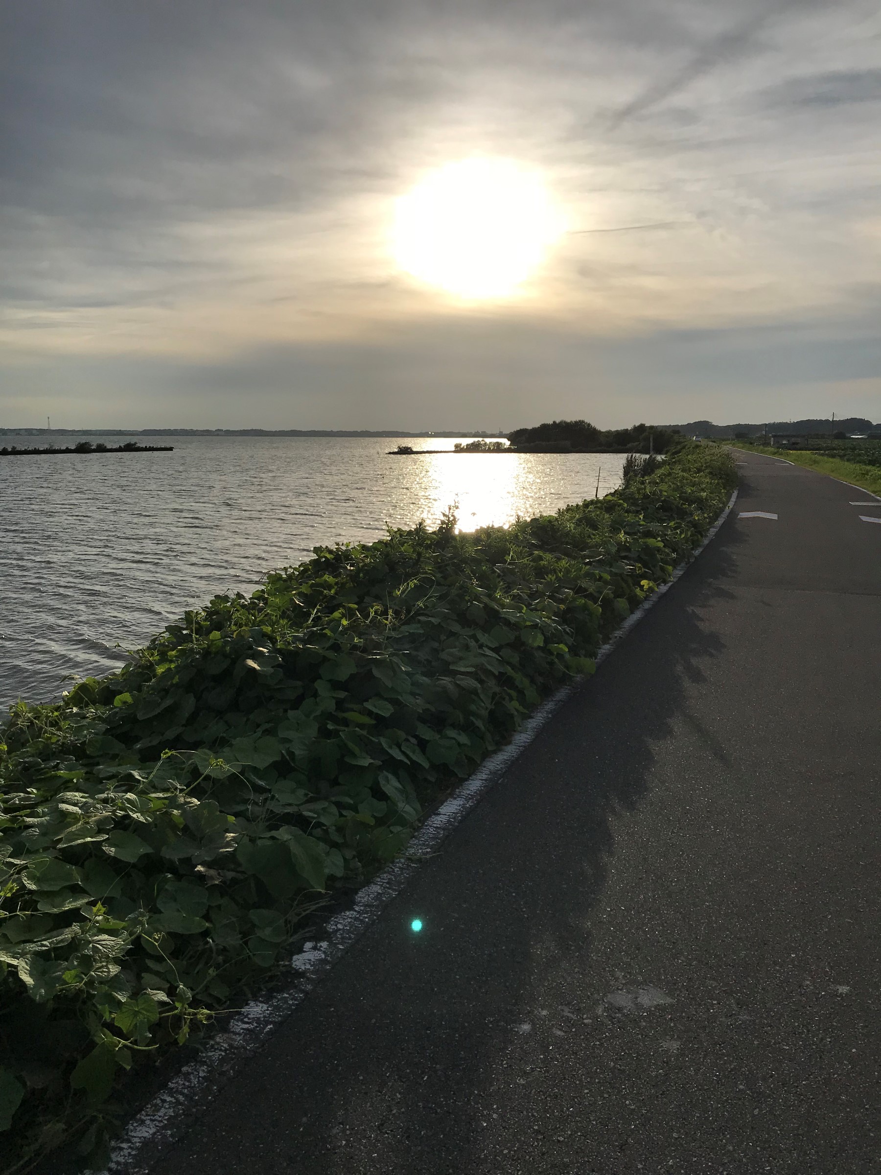 気付けば正面に夕日を眺めながらのサイクリングに。
