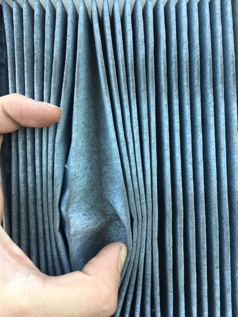 出てきたフィルターがこれです。丸々1年間使ったにしては存外にゴミやホコリなどの堆積は少ないですが、排気ガスなど空気中の汚れを吸着してフィルターが変色してしまっています。