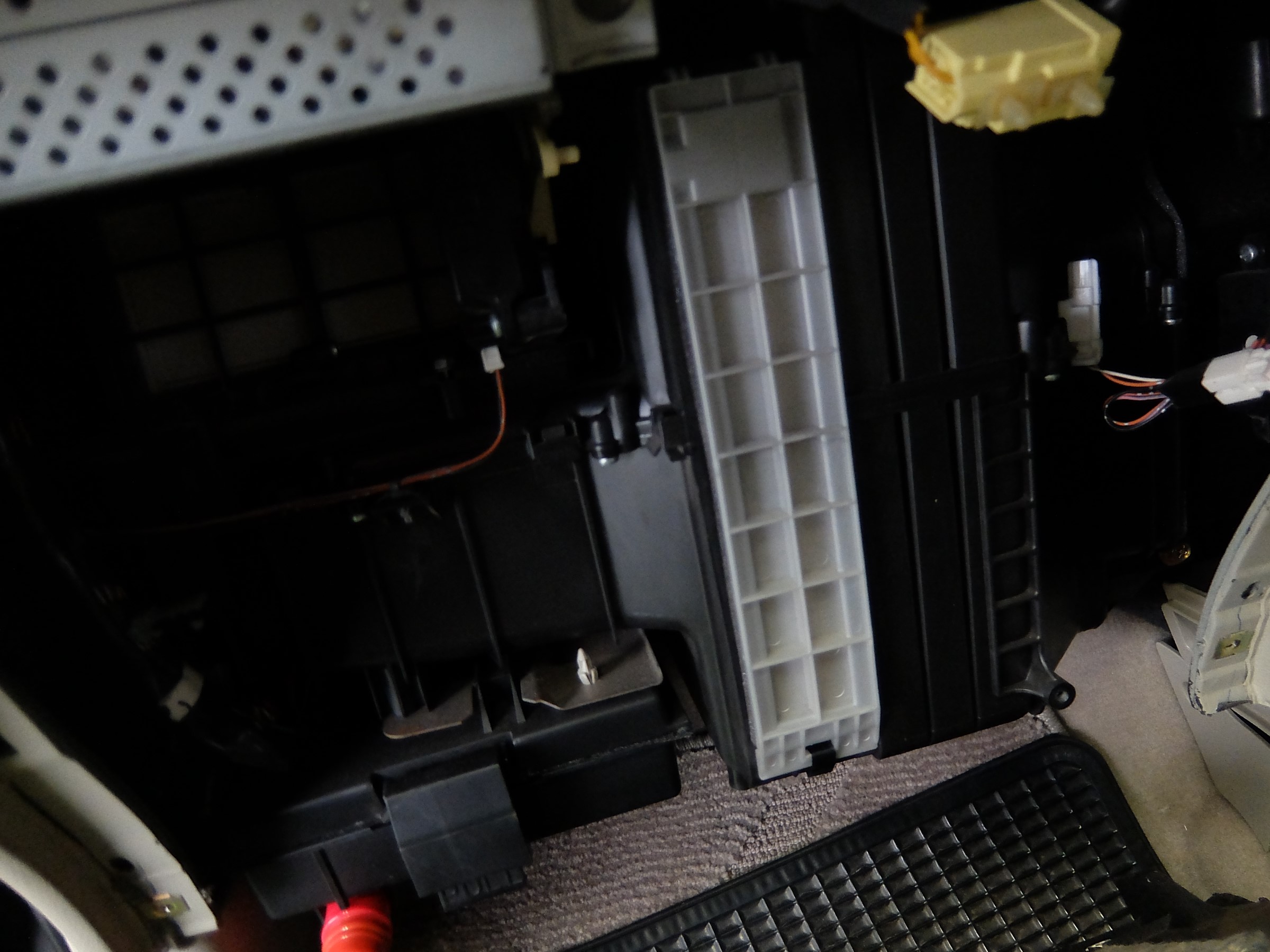 グローブボックス左奥のダンパーを外し、1段目を取り外すと、