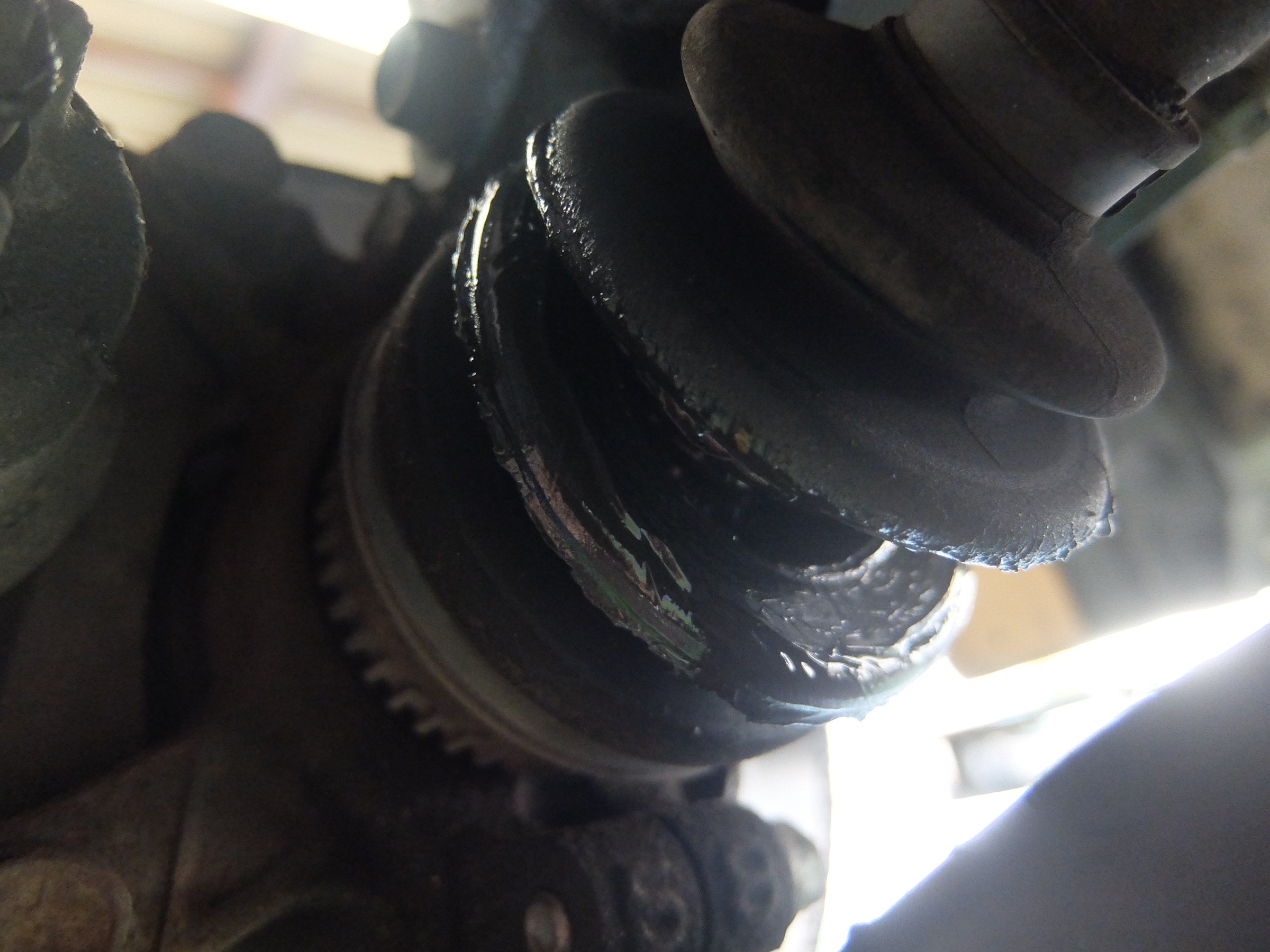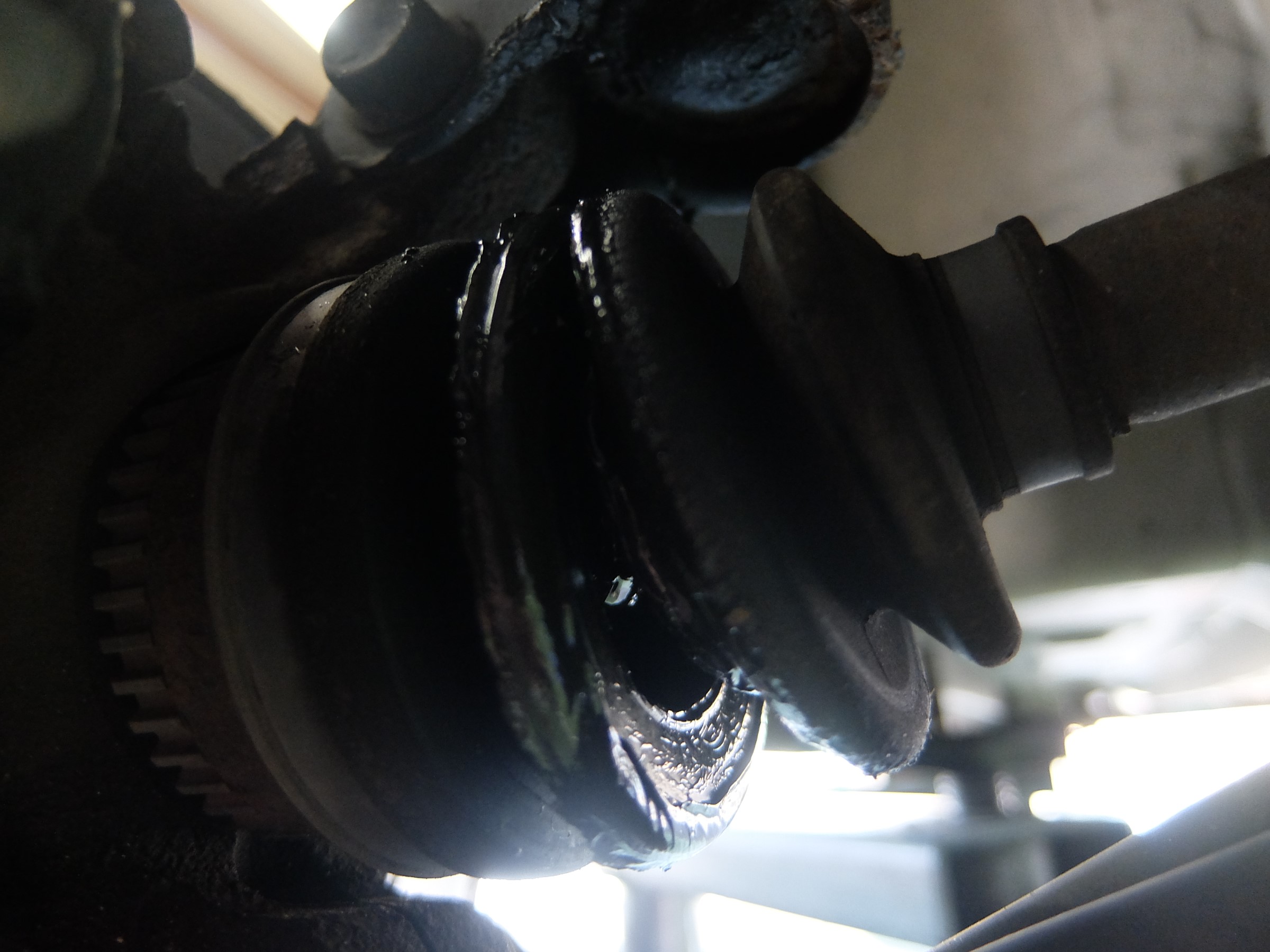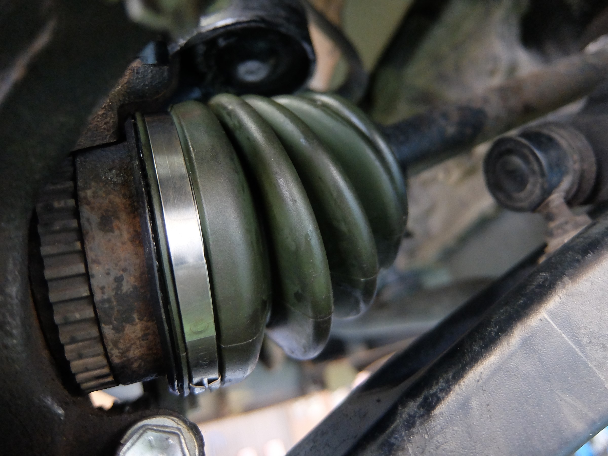 下廻りを点検したところ、ドライブシャフトの外側のブーツがパックリと切れていました。