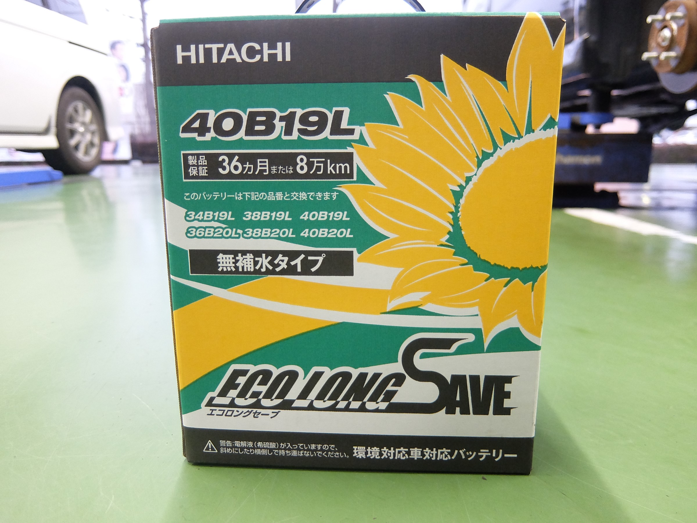 取り付けるのはこちら、日立製のエコロングセーブというバッテリーです。充電制御車という、バッテリーに強い負荷がかかる車種にも搭載できる優秀な物です。
