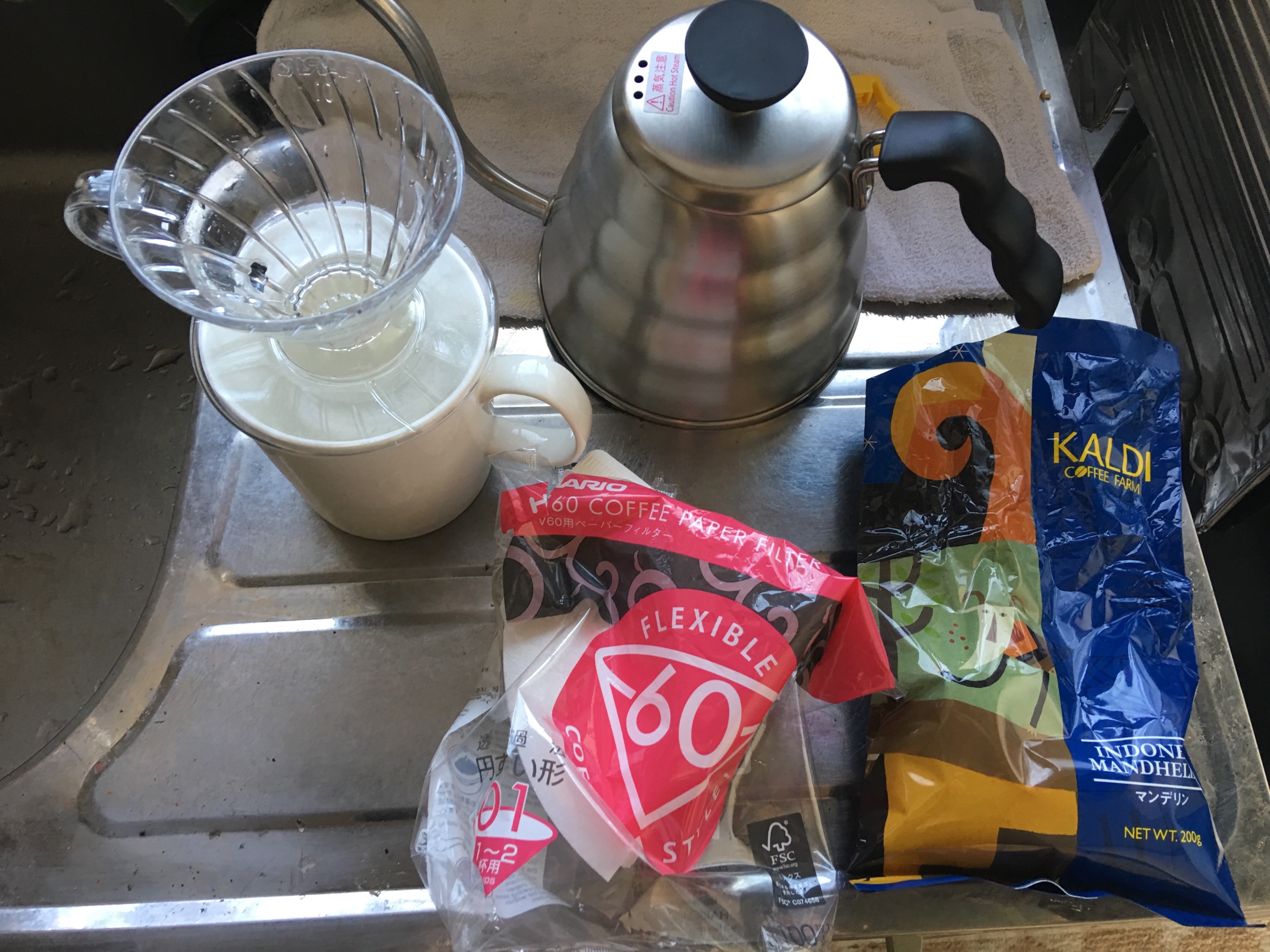 使用するのはこちら、マグカップとドリッパー、ペーパーフィルターとドリップケトル、そして中挽きのコーヒー豆です。
