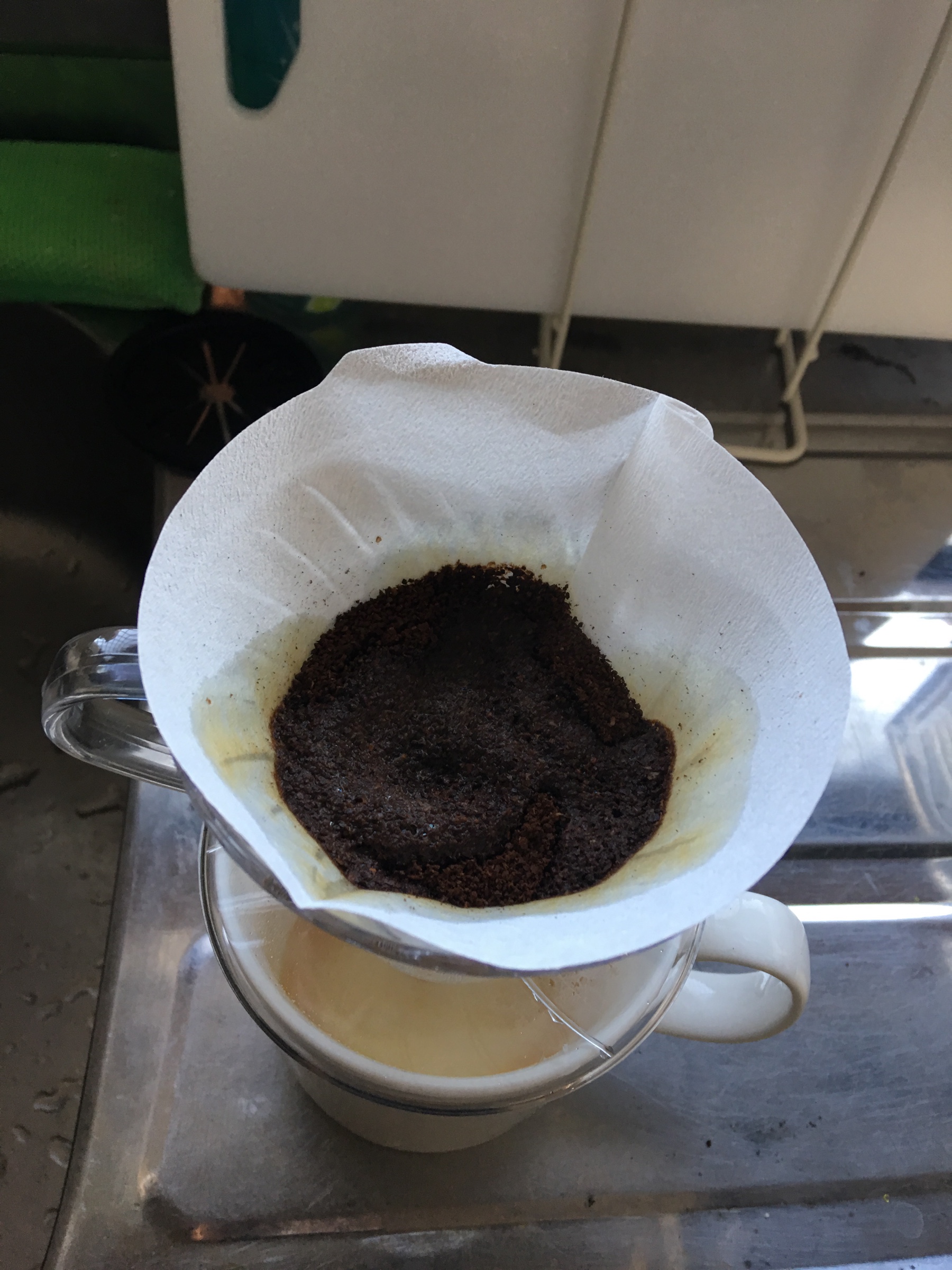 最初の一投は全体を湿らせて40秒ほど放置します。これは蒸らしといって豆表面の凸凹にお湯を浸透させる意味があるそうなのですが、これをやるかやらないかでも味は大きく変わります。結構奥が深いんです。