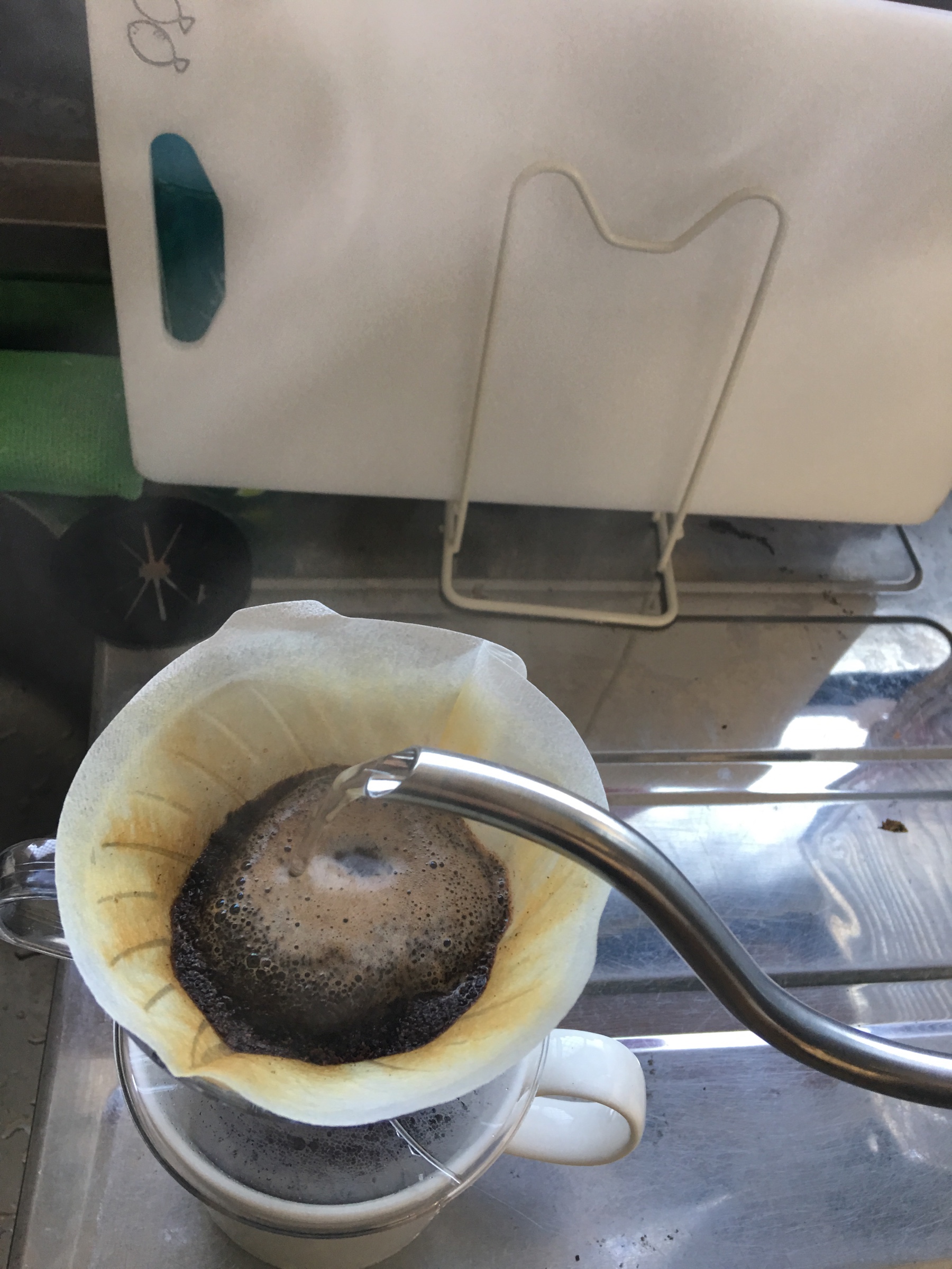あとは豆の土手を壊さないよう慎重にお湯を注いでいきます。出てくる泡は雑味や渋みを含むので、泡が下に落ちる前にお湯を注ぎ足していきます。