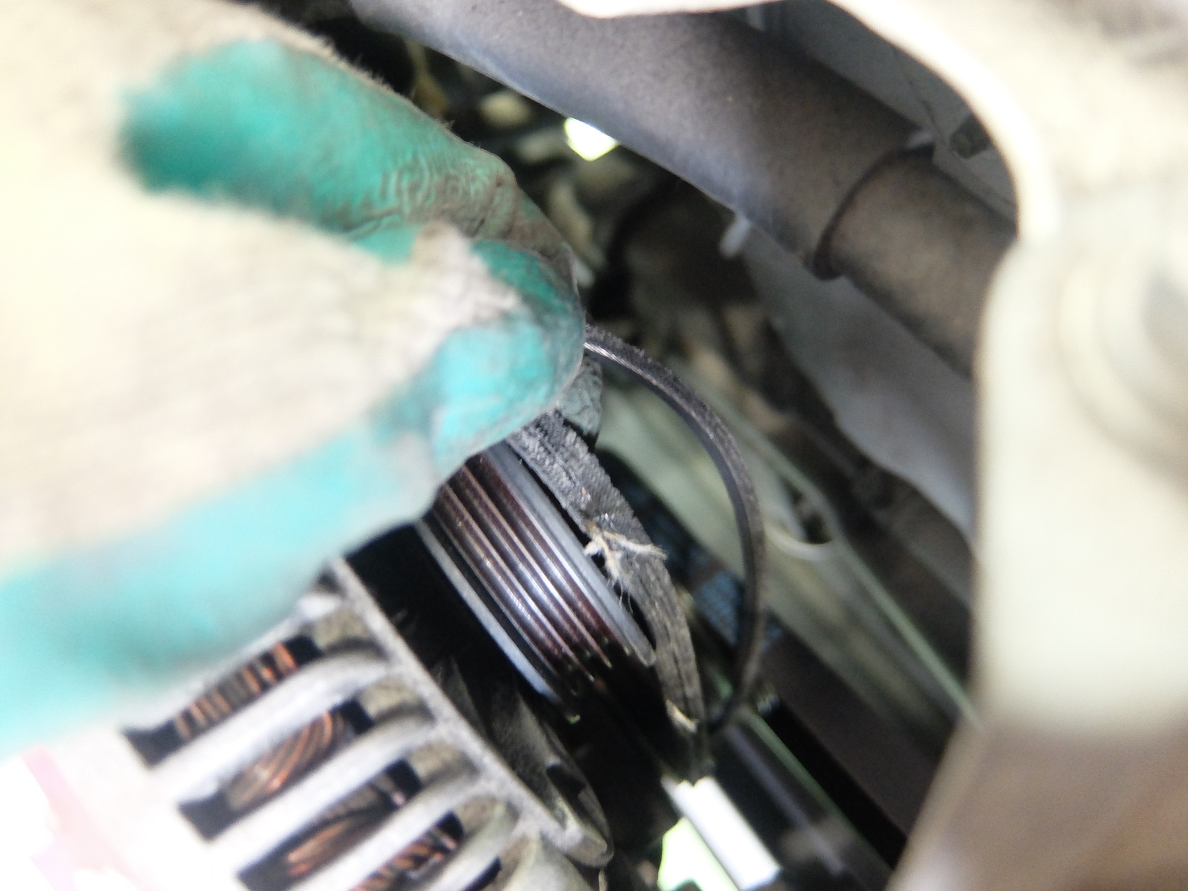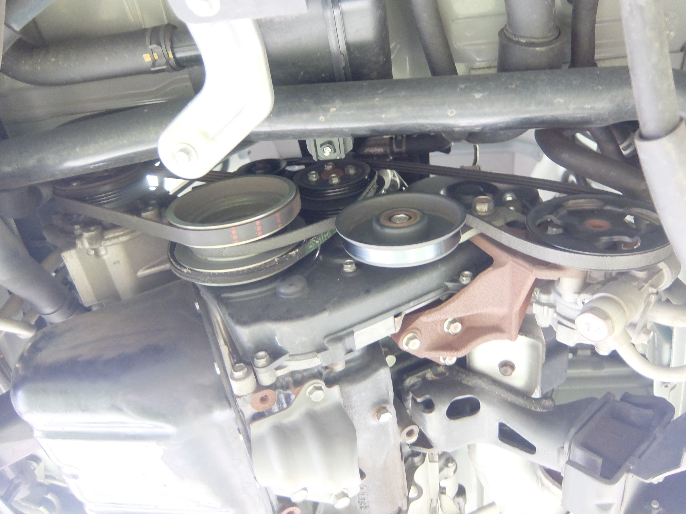 これらのベルトは、エンジンの横にこの様にして取り付けられており、エンジンの回転によってベルトが回され、そのベルトによって様々な補機類(ファンやオルタネーター、エアコンコンプレッサーなど)を作動させているのですが↓
