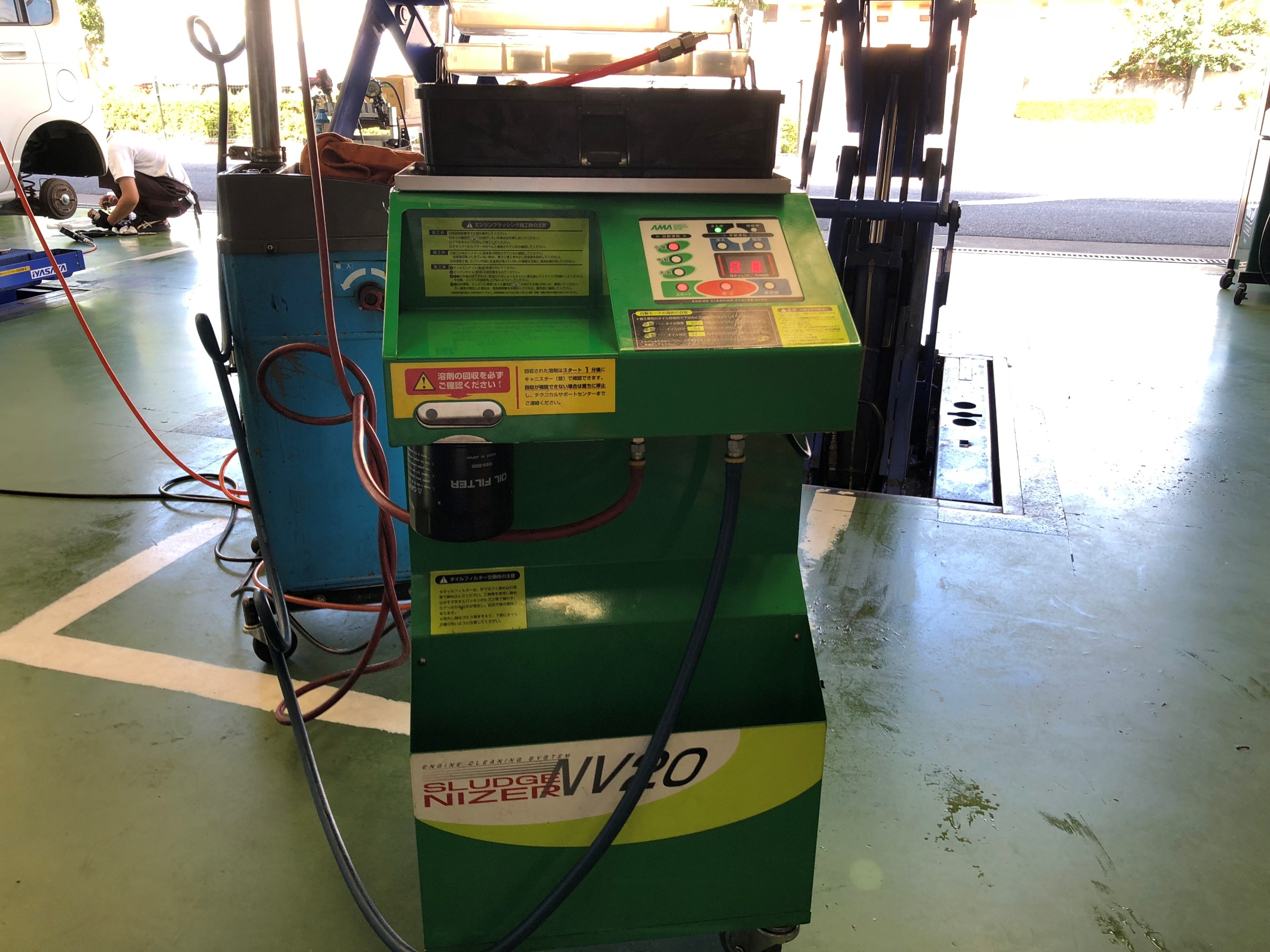 通常のフラッシングオイルと異なる点は、エンジンを停止して施工するため、エンジン内の摺動部分を傷めることがなく、 フラッシングオイルより清浄分散作用の強い溶液を波動流として送り込むため、フラッシングでは取りきれない汚れも落とすことができます。