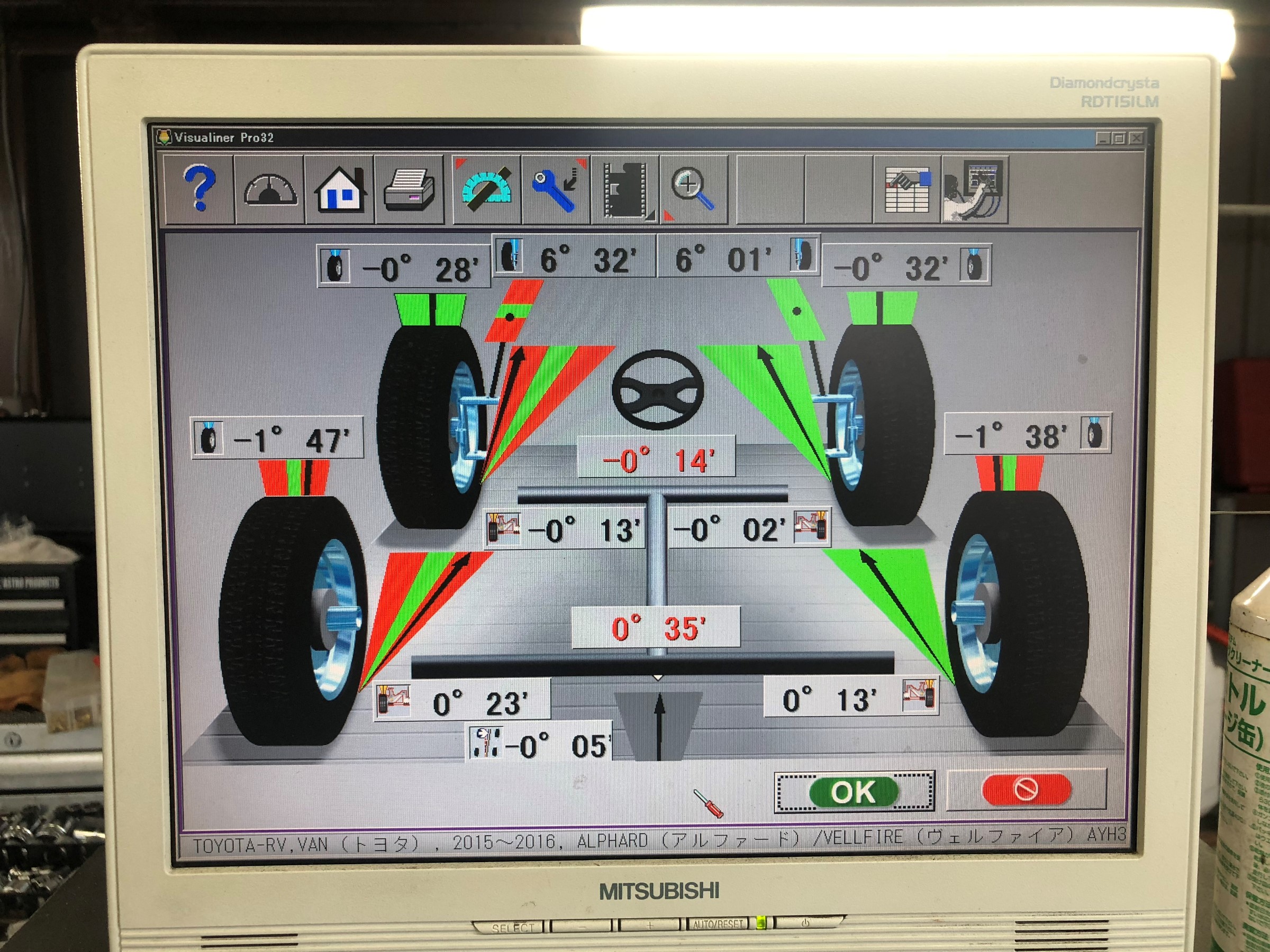 【トヨタ・ヴェルファイア・AYH30W】アライメント調整 ポスト 2019年10月7日 こんにちは!大山です! 本日は、トヨタ・ヴェルファイアのご紹介になります。 アライメント調整のご依頼をいただきました。 アライメントは走行を重ねるごとに、徐々にズレてしまいます。 ズレが大きくなると、走行安定性の低下やタイヤ偏摩耗の原因になります。 定期的なアライメントの点検をおすすめします! カテゴリ:タイヤ関連 担当:大山