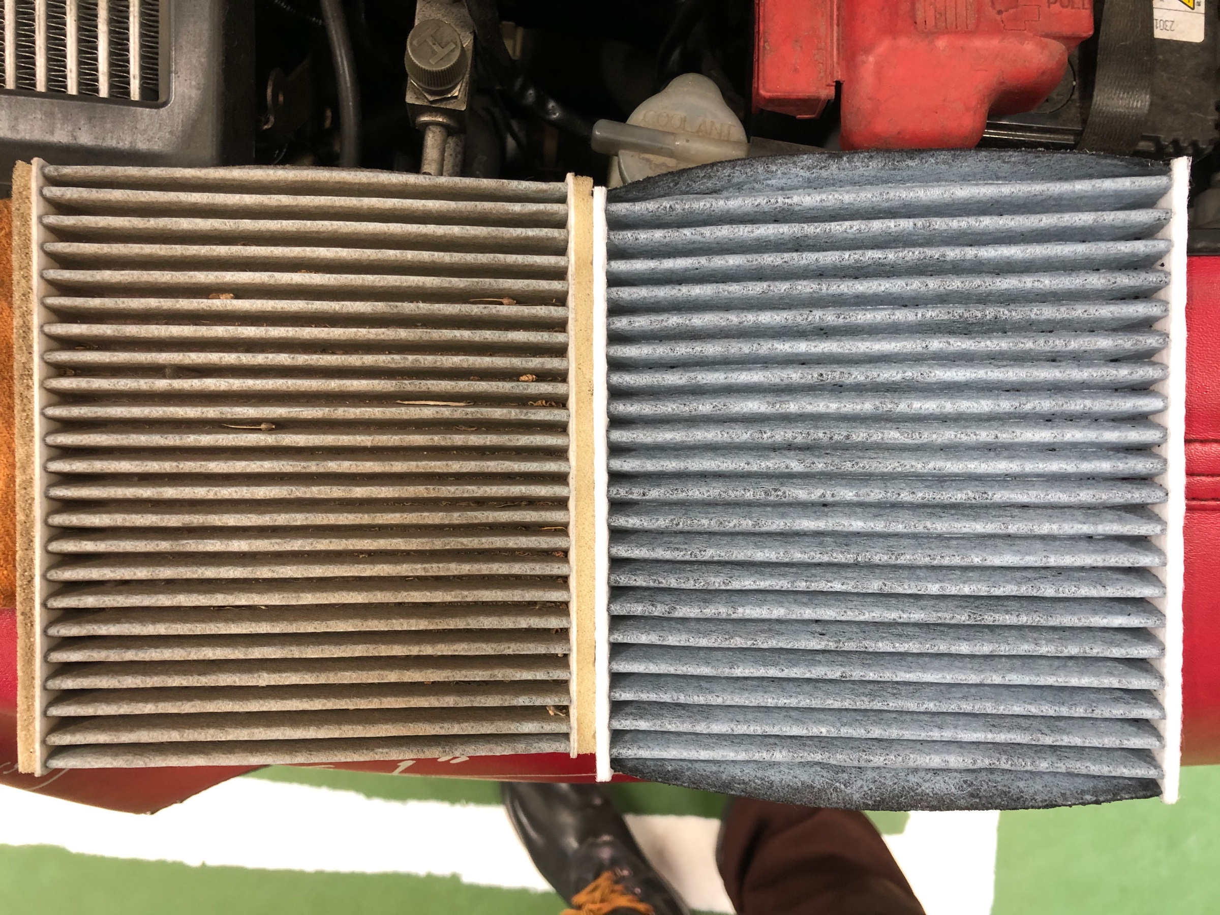 花粉の除去もこのエアコンフィルターを交換するだけでエアコンをつけた時の車内の花粉は風と一緒に出てこないんです!