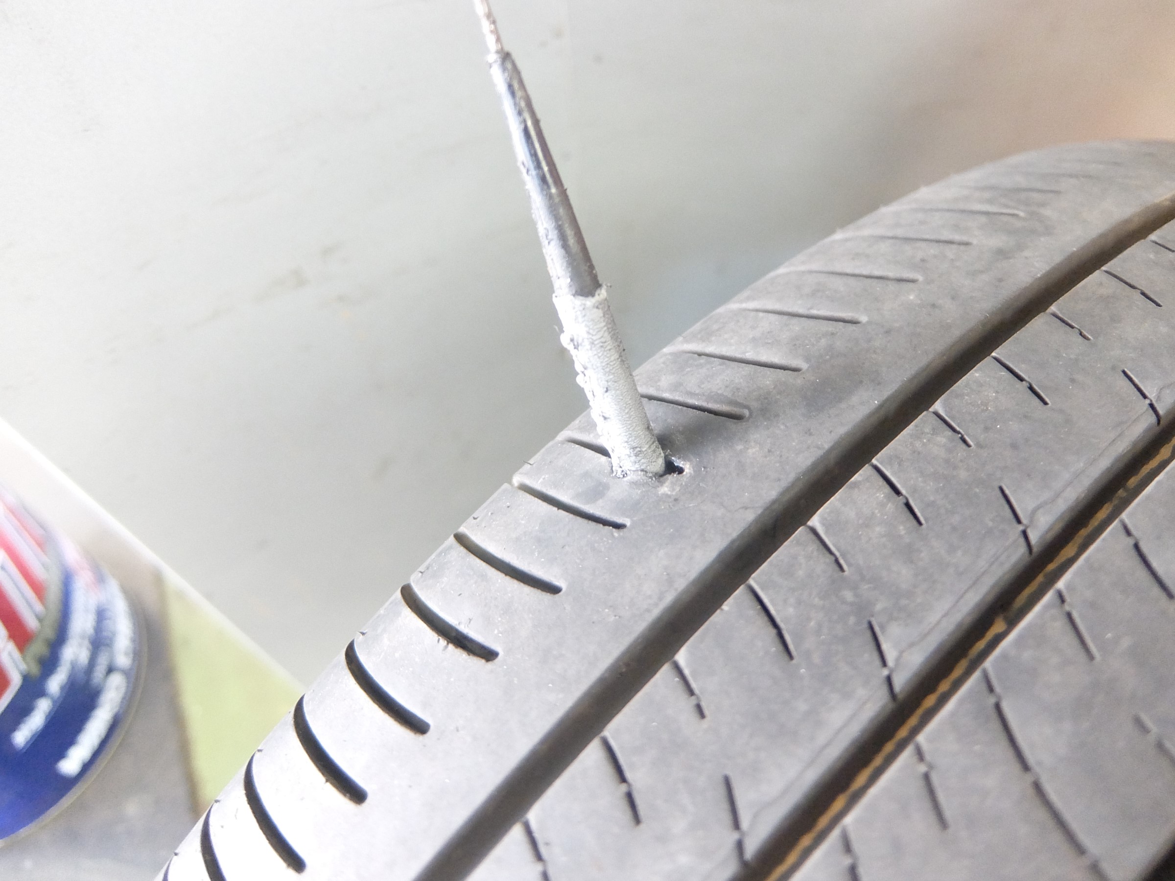 見てみると、確かにタイヤに釘が刺さっており、そこから空気が漏れているのが確認されました!