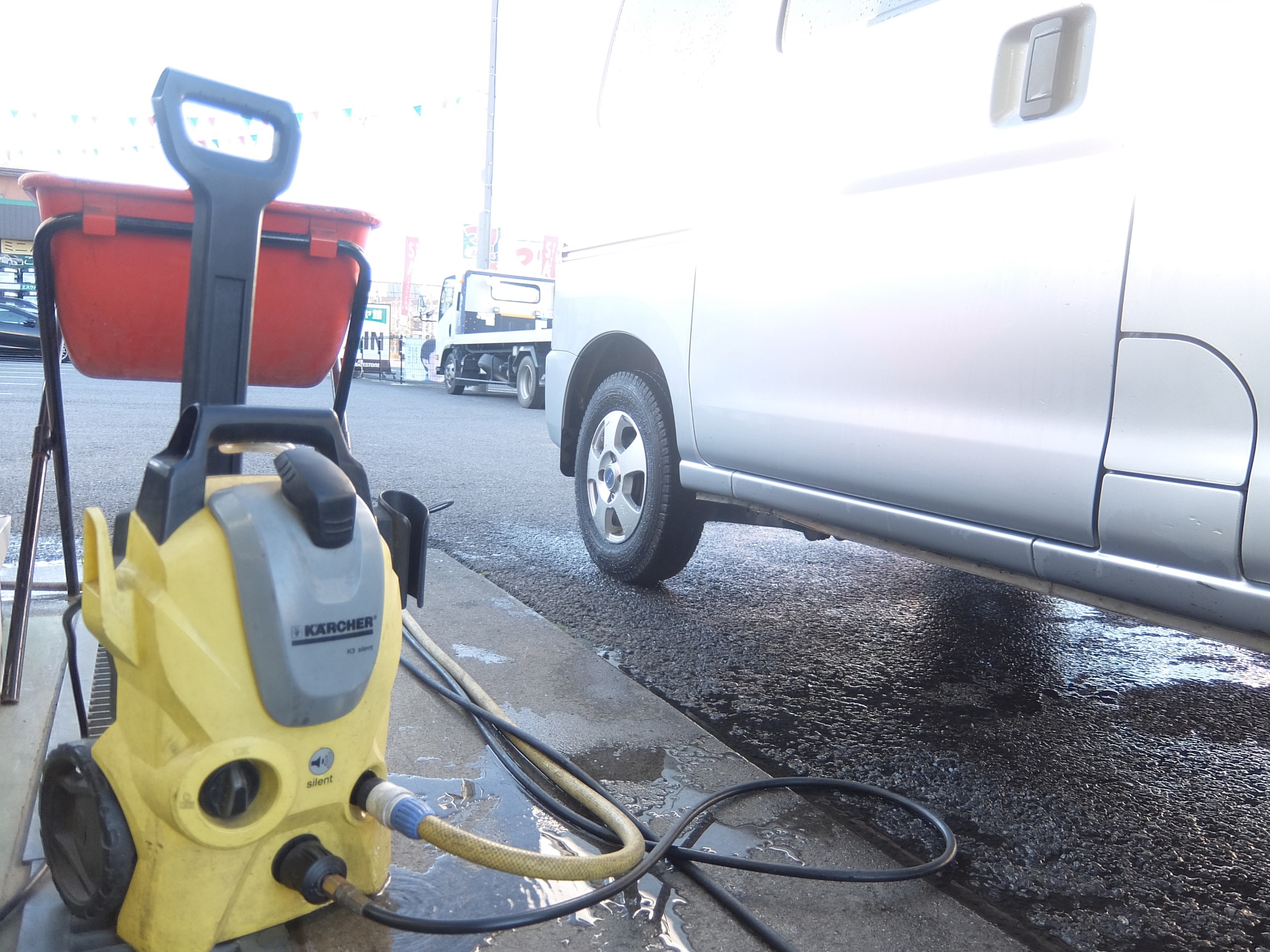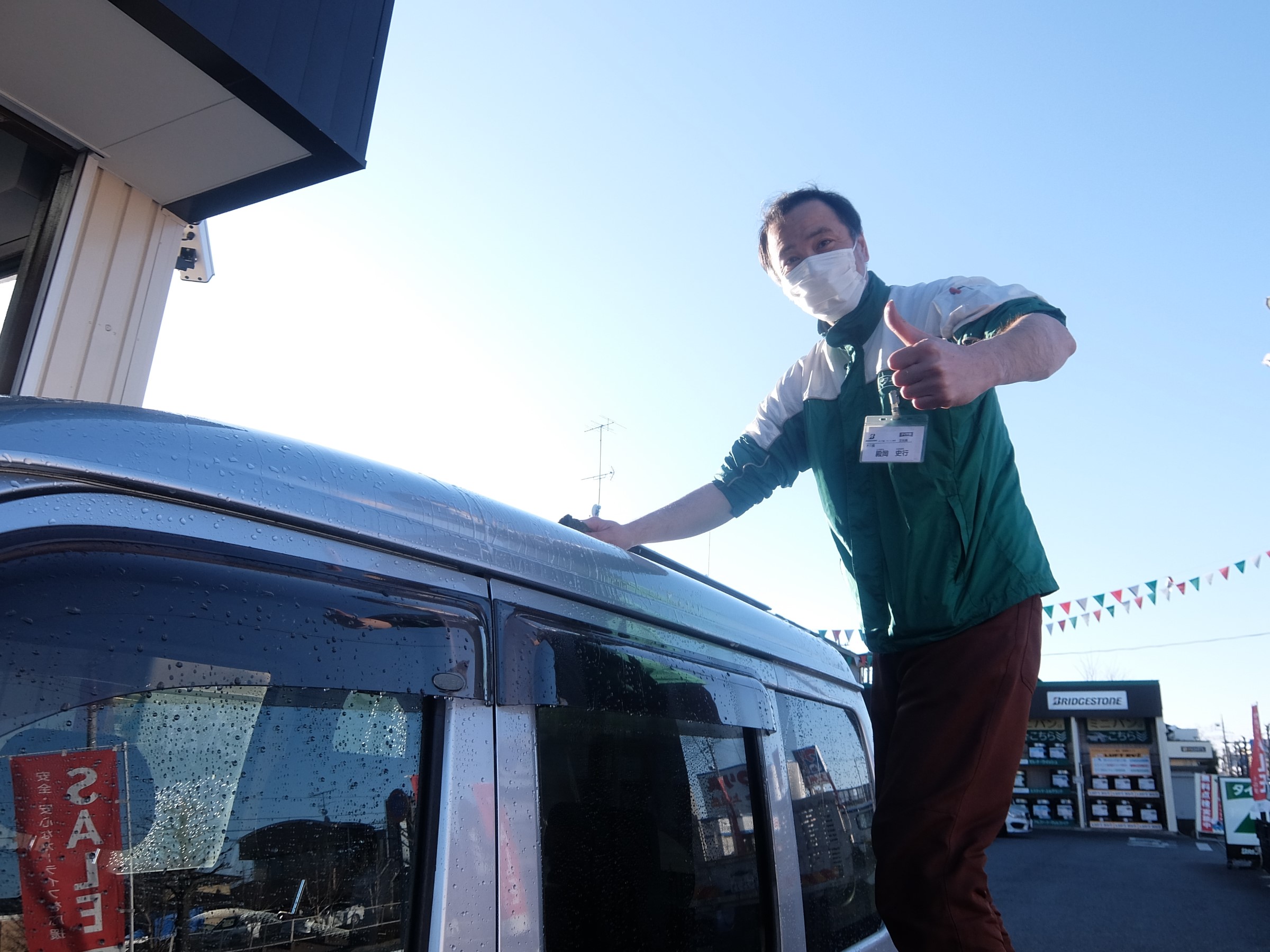 殿岡ピット長が洗車しているのは、車検をお任せ頂いた常連様の軽自動車です!