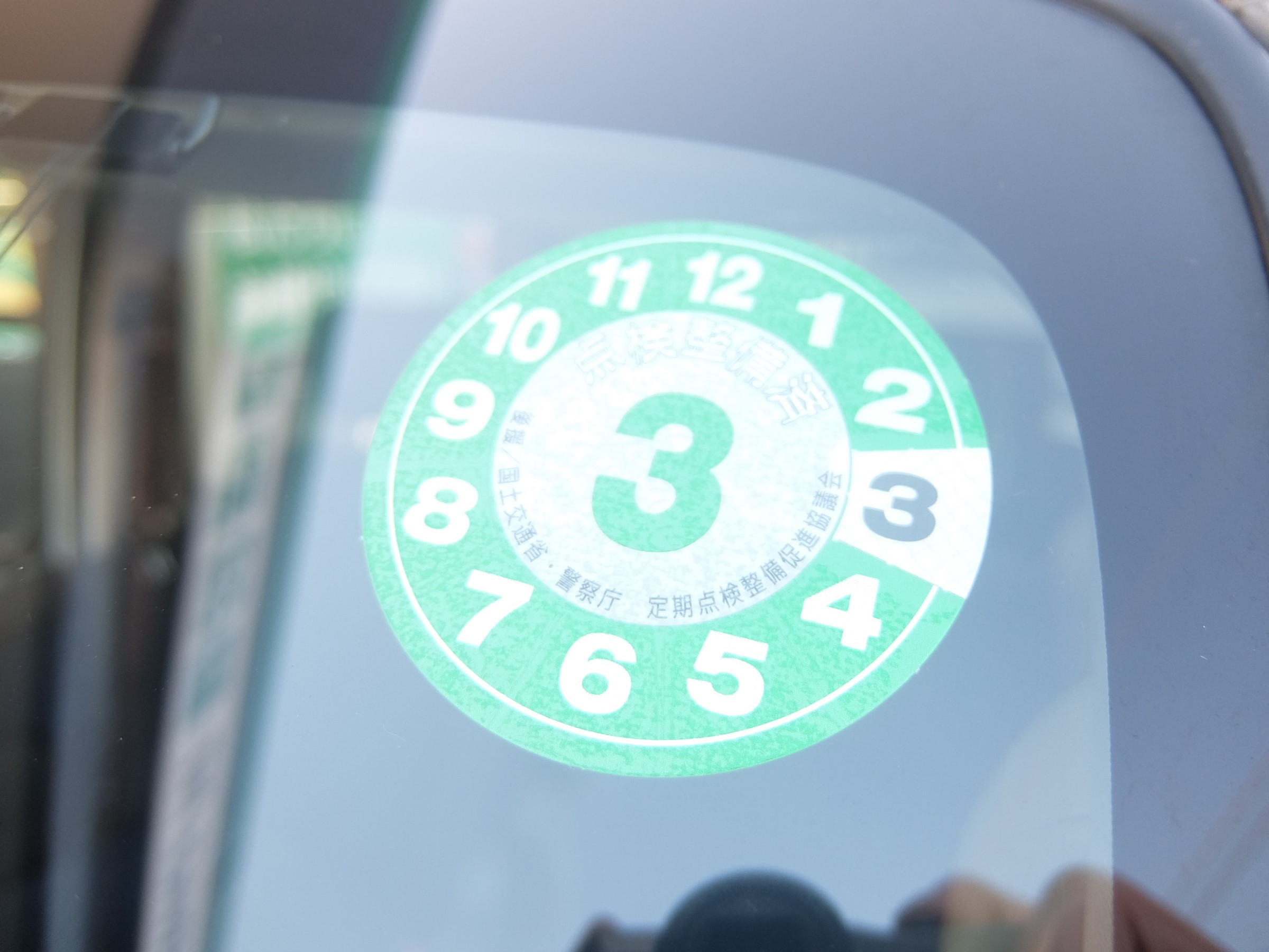 車検を通してから1年後の法定点検ですね!この丸いステッカーに期日が書いてありますので、車に乗ったときにチェックしてみてください!