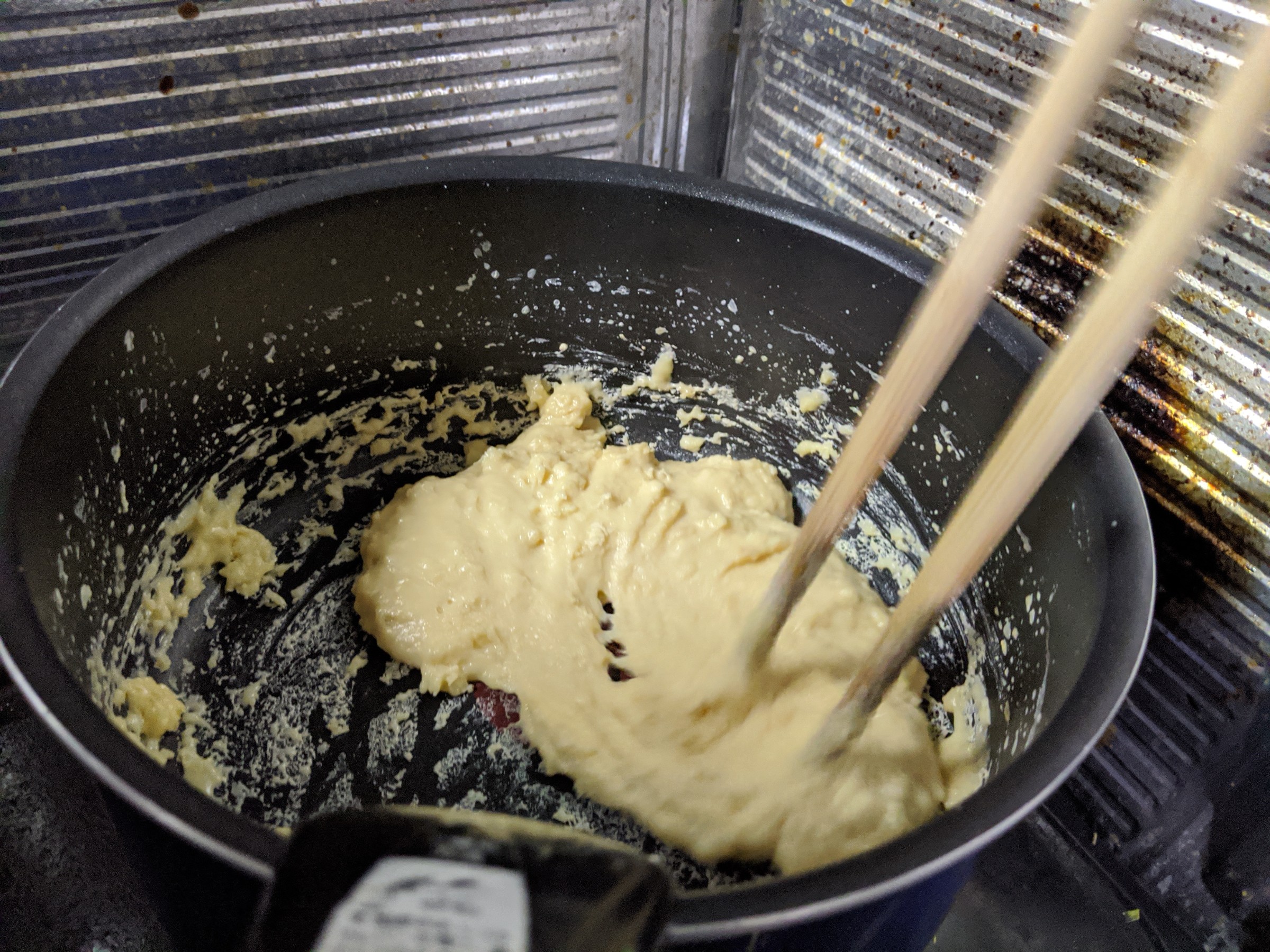 ここまでくると固くなってきて混ぜることが難しくなるので、粗熱を取って冷蔵庫で数時間冷まします。