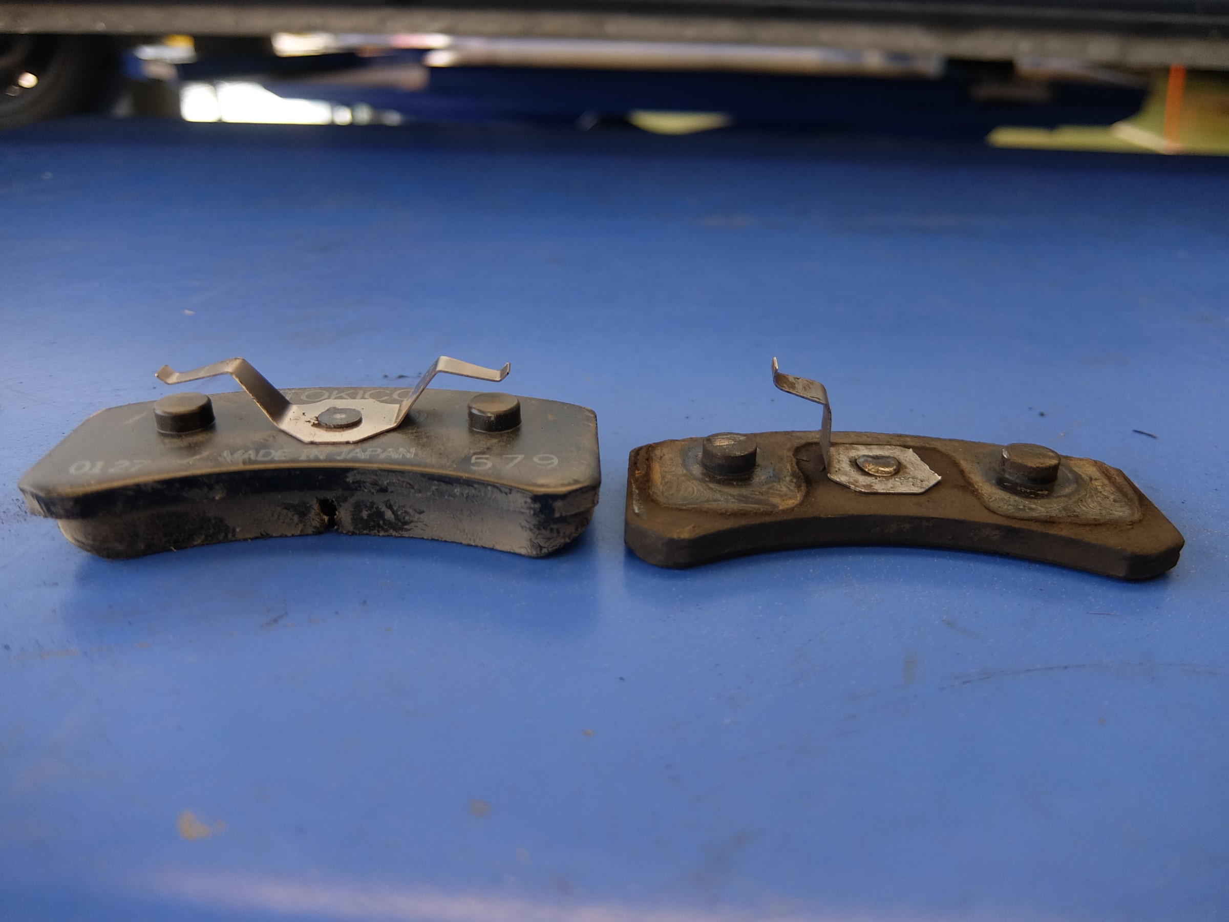 ブレーキパッドを外してみると新品に比べてかなり少なくなってしまっていました。