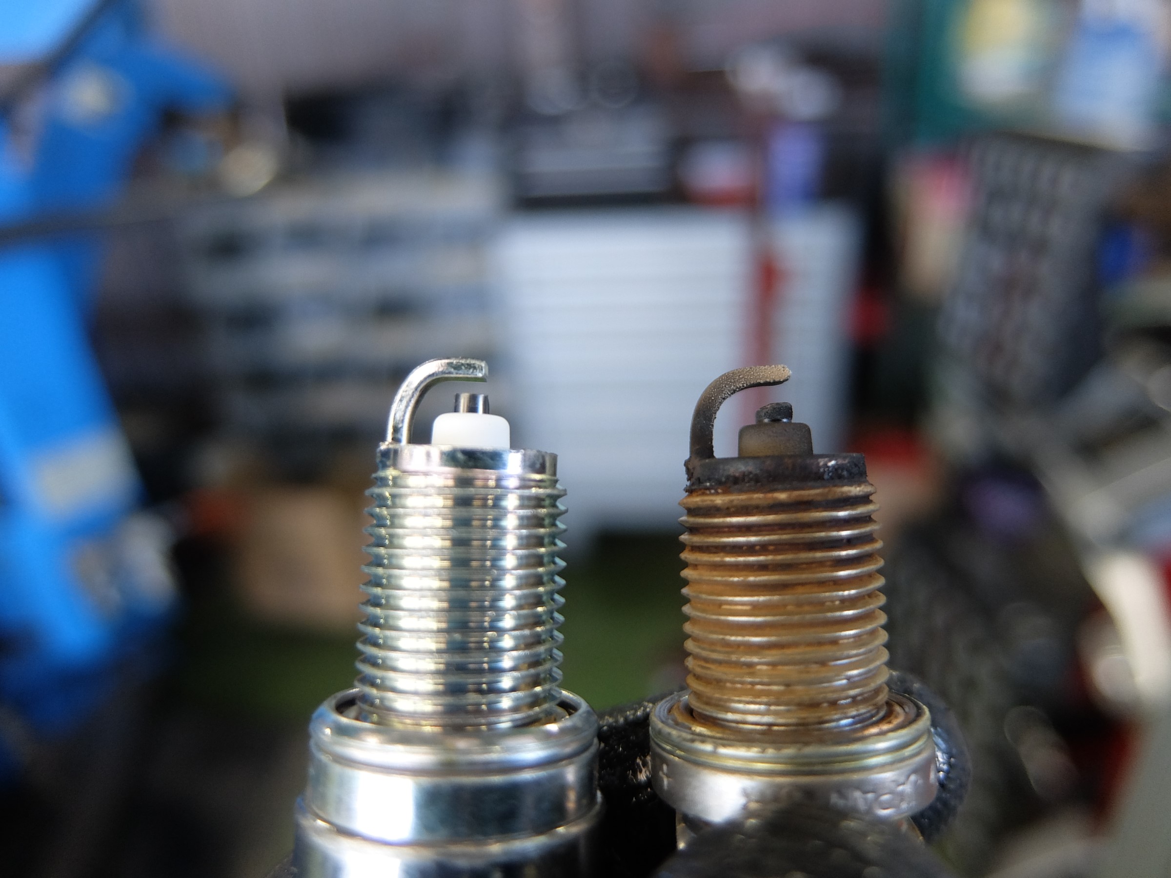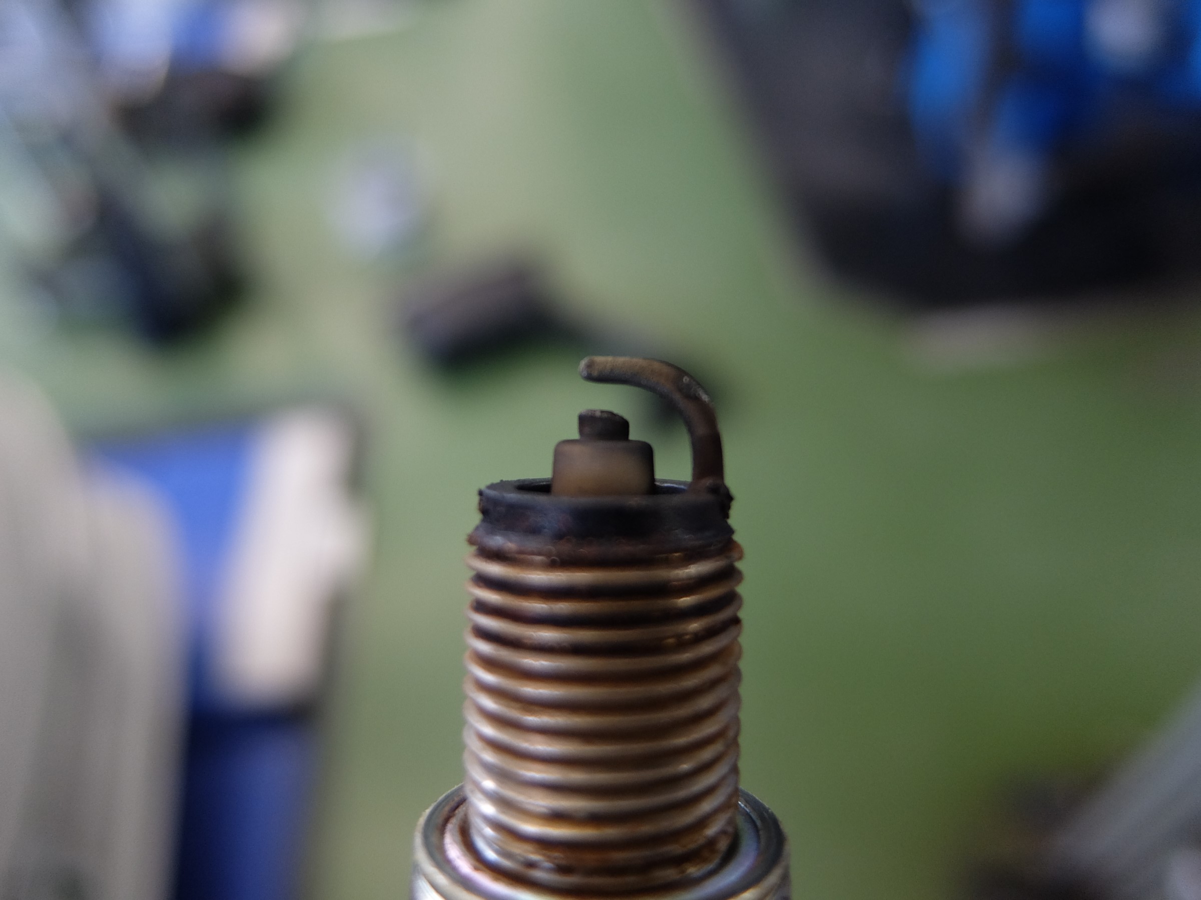 取り外したプラグを見てみると、やはり電極が摩耗しているのと、煤による変色が見受けられます。