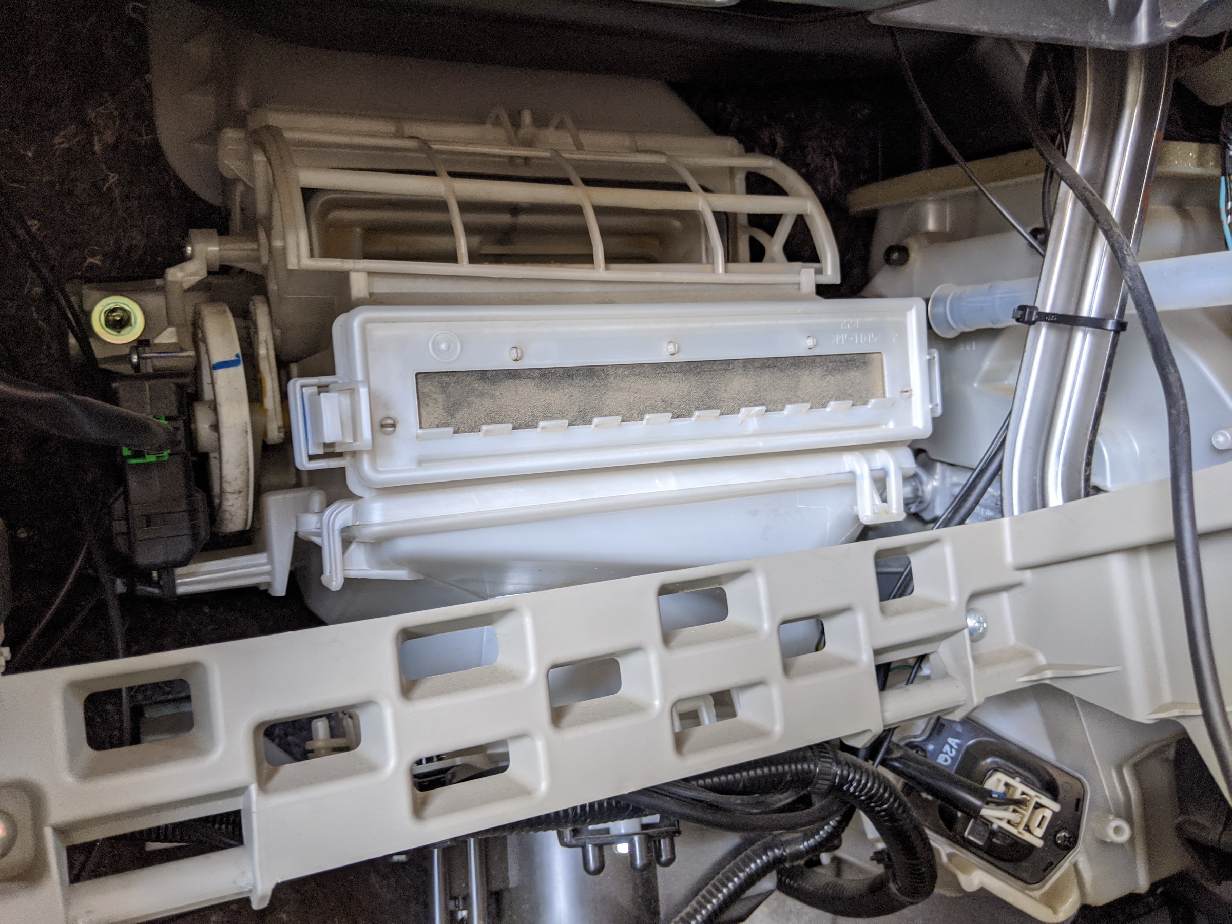 後は、両側のつまみを押さえながらフタを引けば、エアコンフィルターが見えてきます。