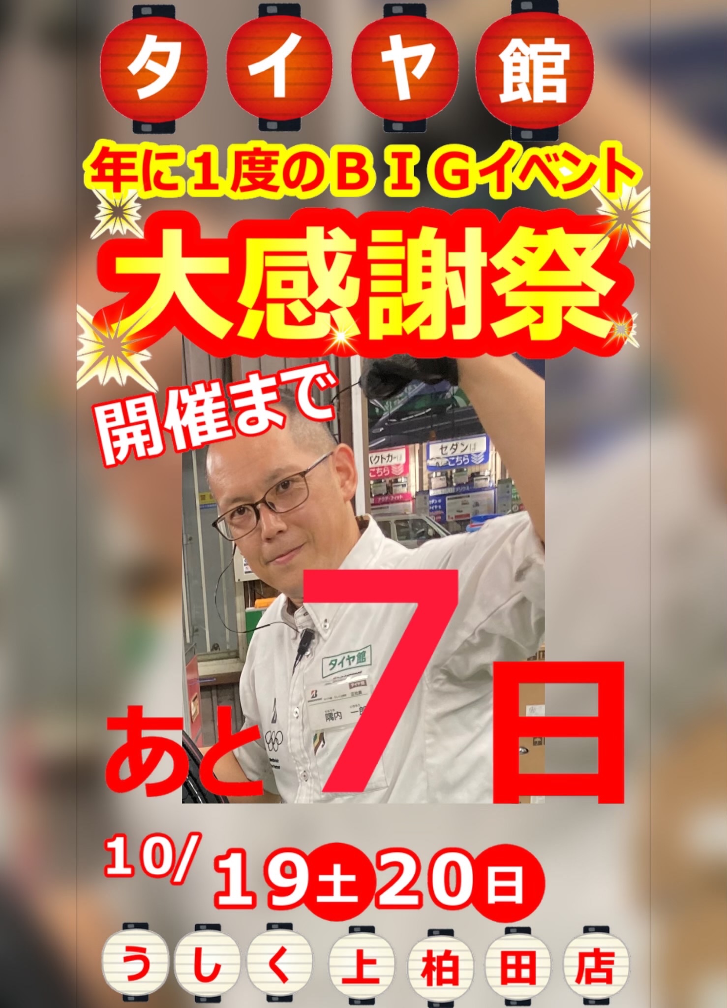 こんばんは! いつもタイヤ館うしく上柏田店のWEBをご覧くださりありがとうございます。 いよいよ大感謝祭まで一週間をきりました。商品がお買い得なのもそうですが楽しいイベントなども企画していますので是非楽しみにしていてください! スタッドレスをお探しの方やメンテナンス関係の交換を検討...