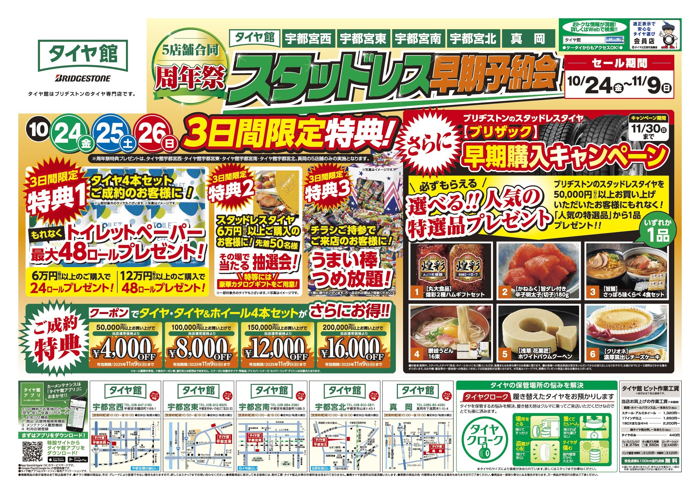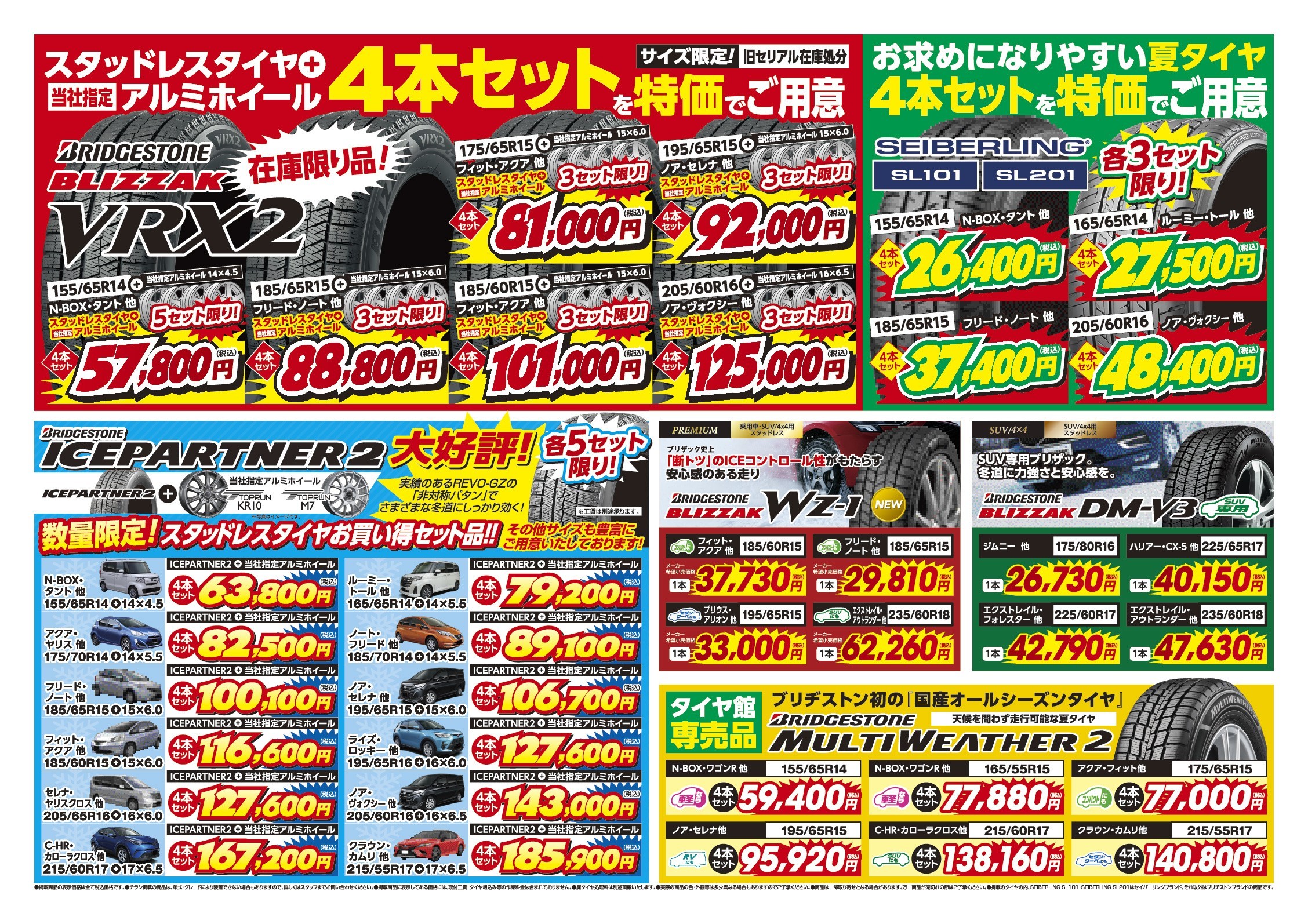 スタッドレス早期予約会スタート!! ポスト 2025年10月24日 こんにちは!! 10月24日(金) ~ 11月9日(日)まで スタッドレス早期予約会スタート致します!!! 三日間限定でプレゼントお渡しもございます!! 皆様ぜひご利用ください!! カテゴリ:お知らせ