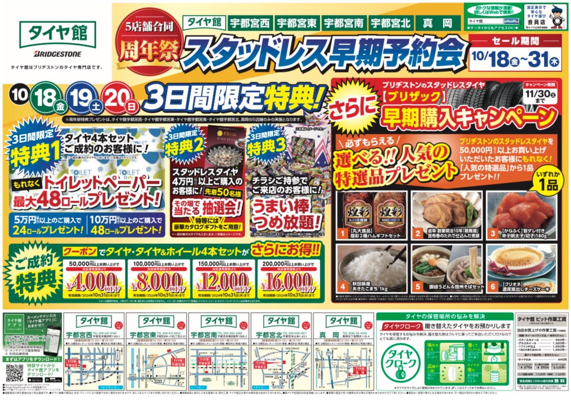 こんにちは! いつもタイヤ館をご利用いただきありがとうございます! ただいまタイヤ館(宇都宮西.東.南.北.真岡)では、周年祭を開催しております。 在庫処分などを特価品でご用意しております! ※各3セット限定 さらに、期間中スタッドレスタイヤを5万円以上購入いただいたお客様には 選べる特選品...