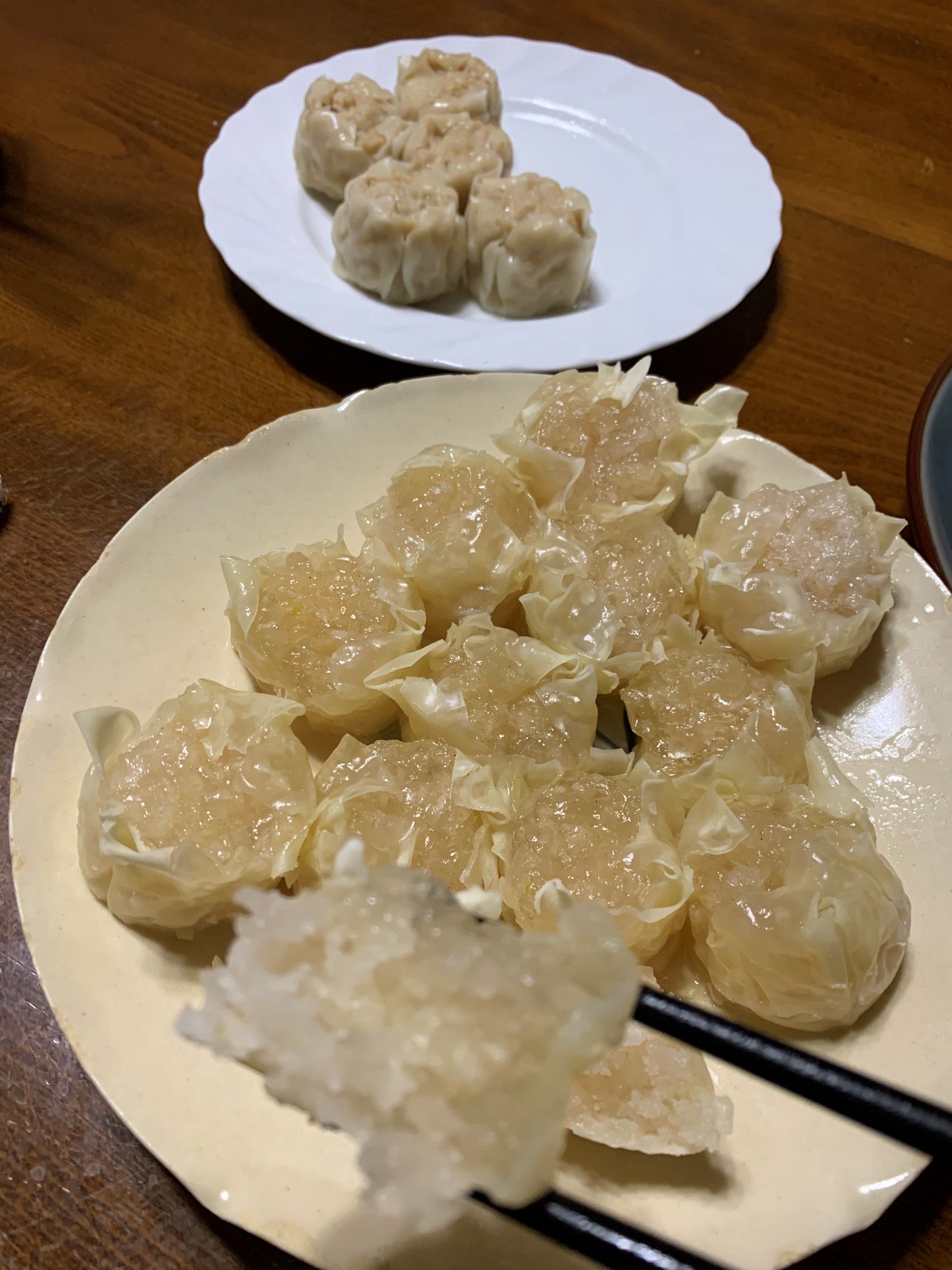 写真の手前が足利シュウマイで奥が一般的に食べている肉シュウマイです。