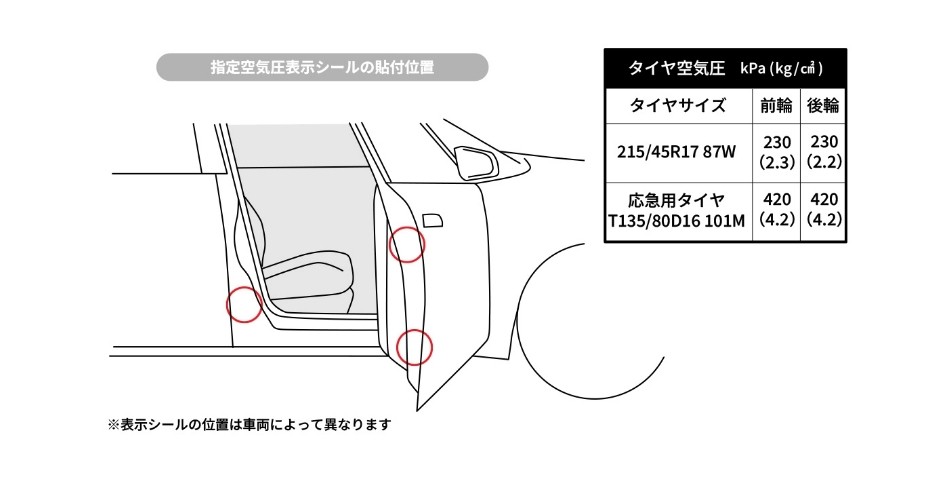 指定空気圧とは、運転席のお車のドア表記にございます。